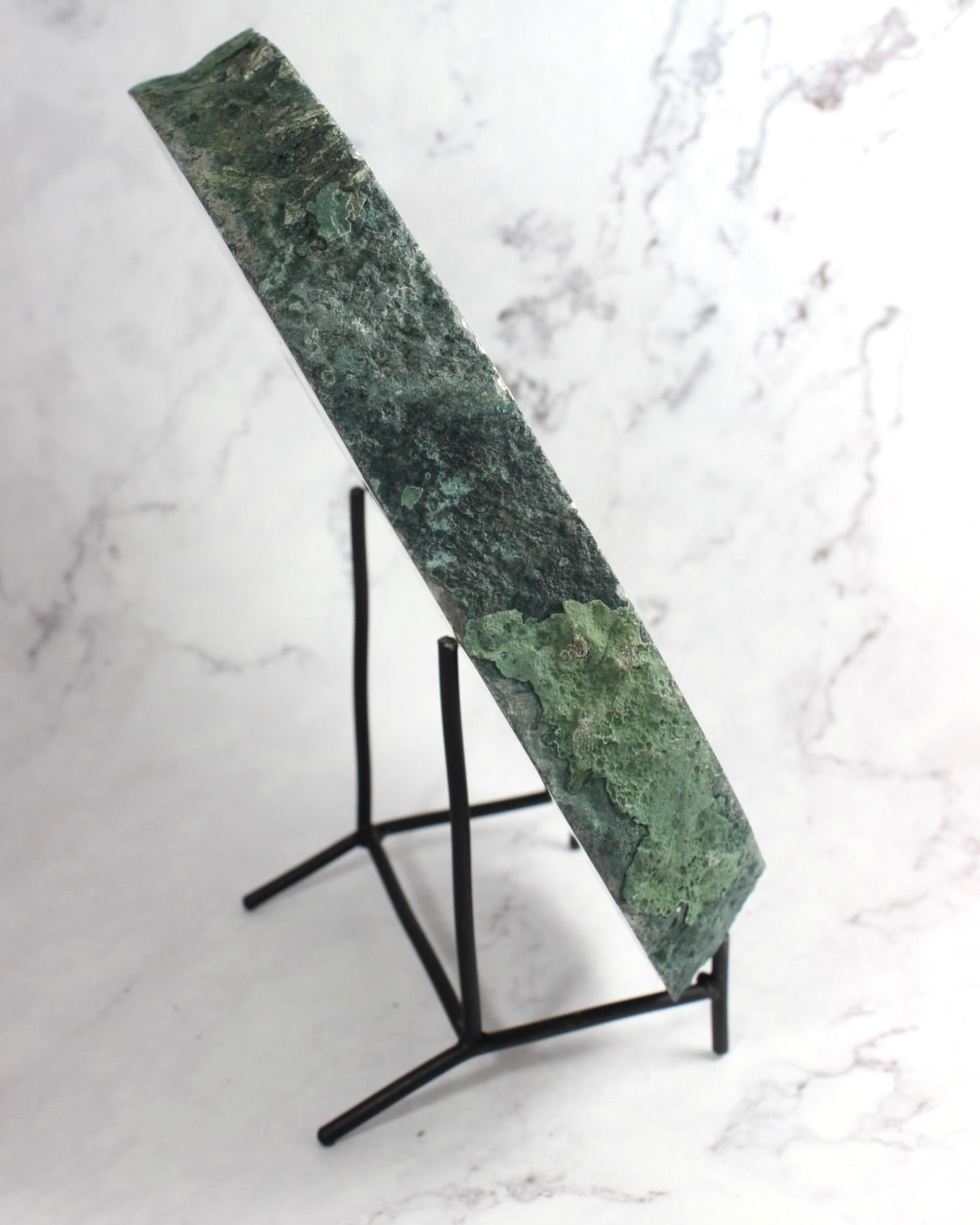 This piece is a thick cut of an amethyst geode from Brazil. An acrylic stand is included for the perfect display.