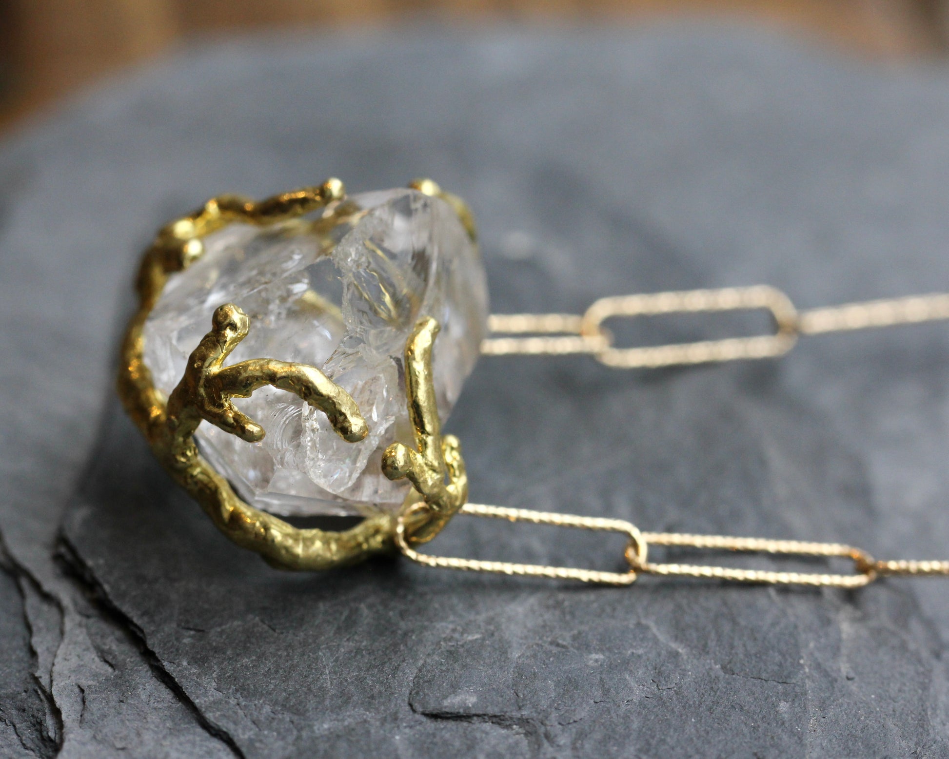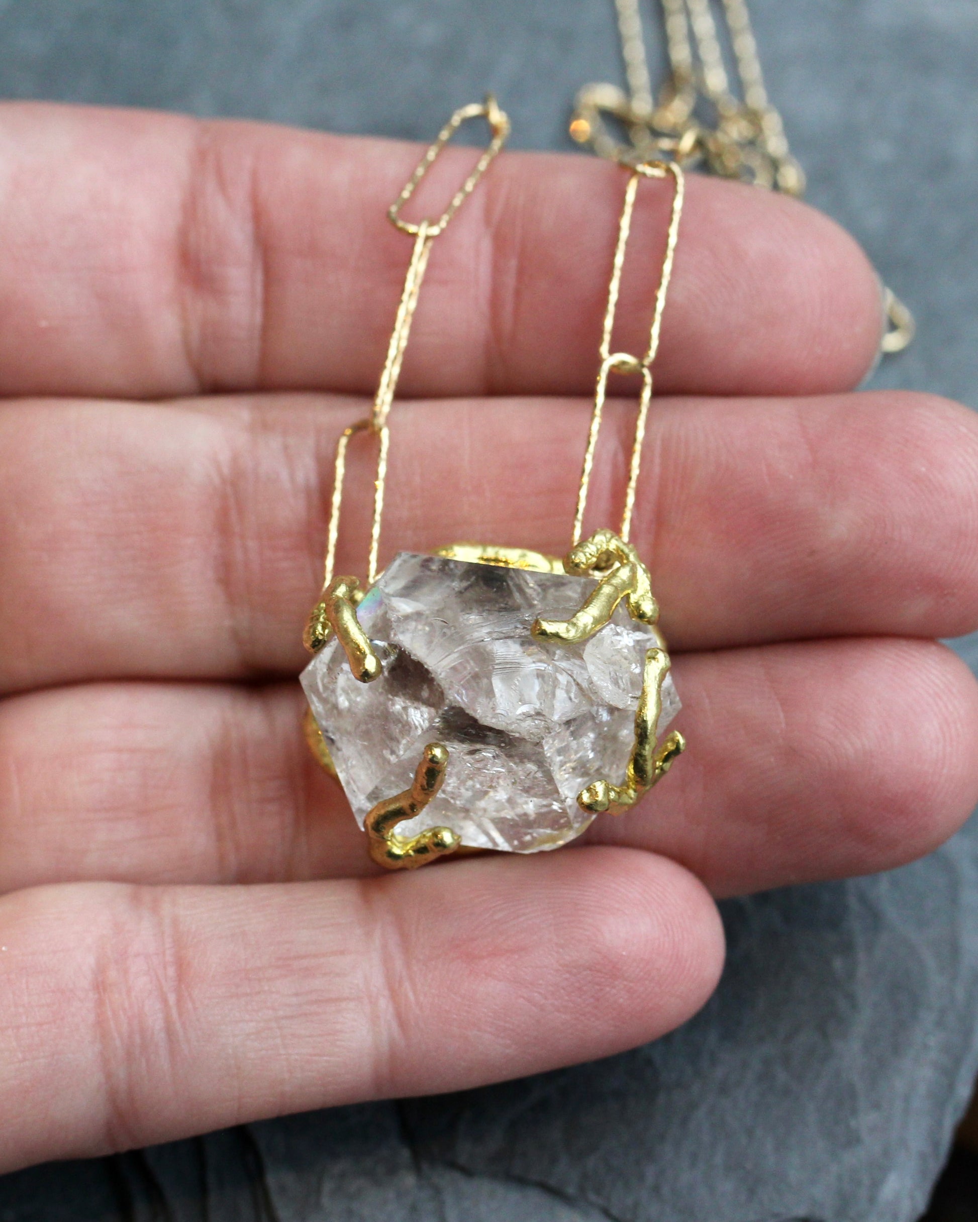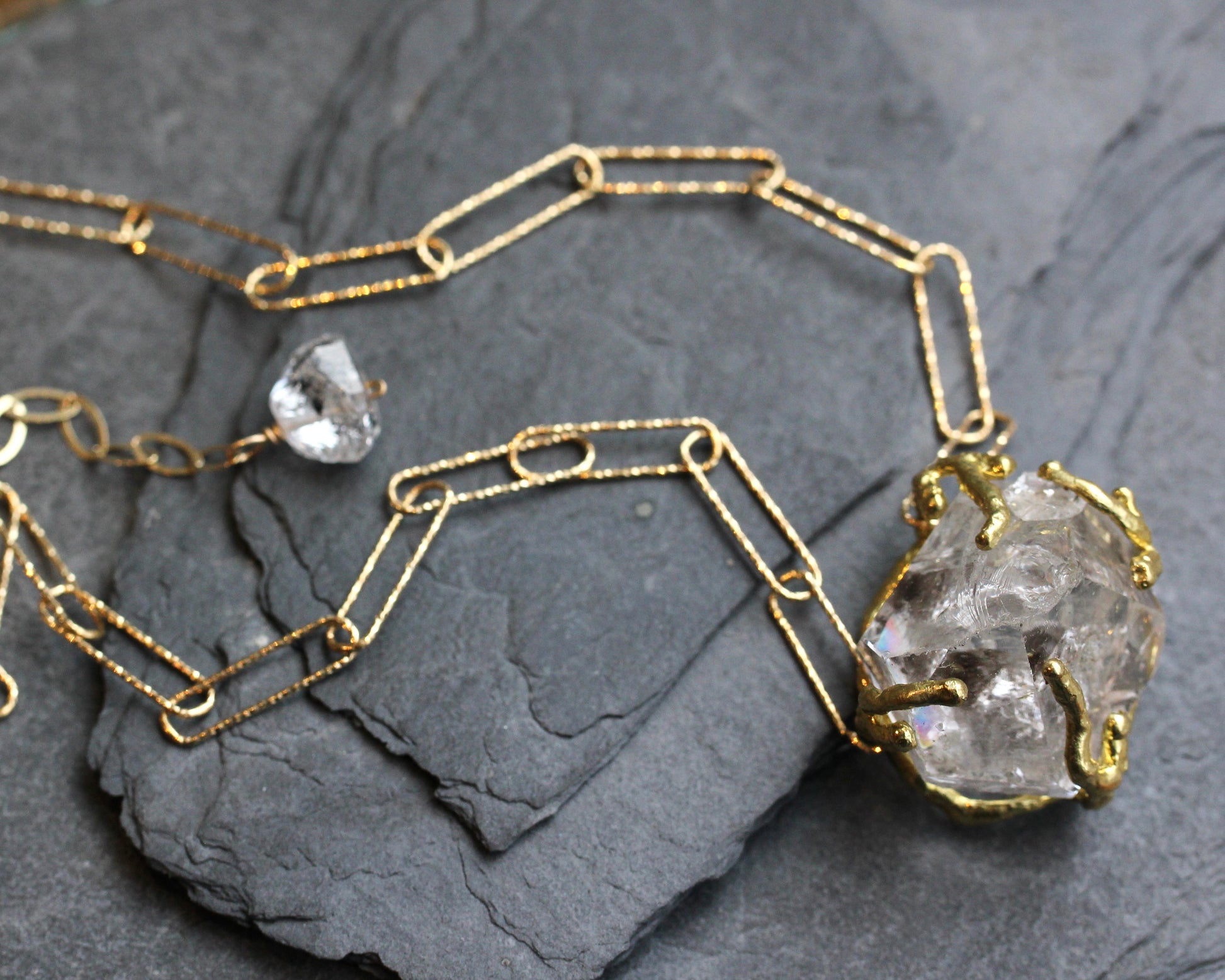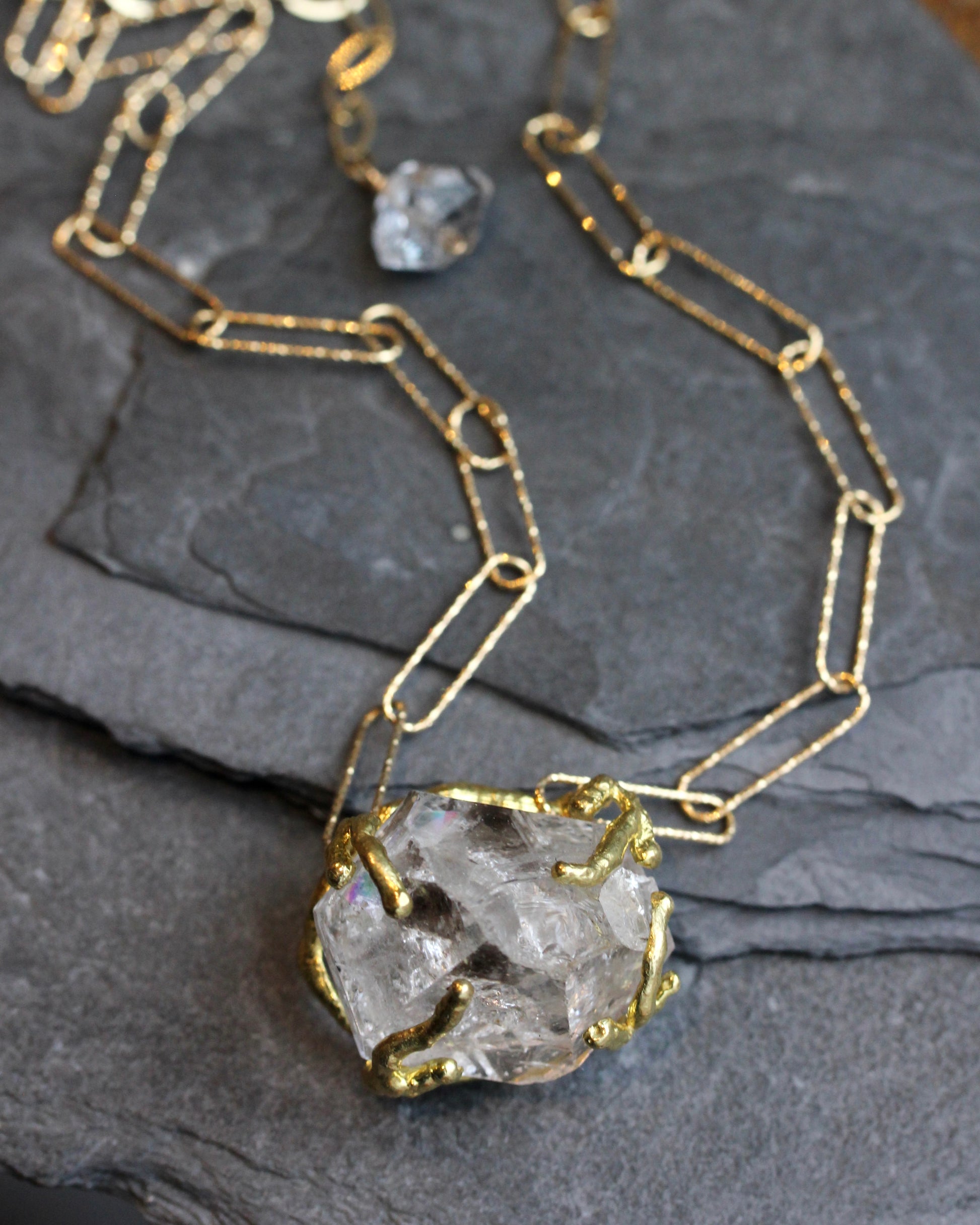 This necklace features an imperfect Herkimer Diamond crystal. It sits in a raw, brass setting. This chunky crystal measures 22mm x 25mm x 20mm and is suspended between a gold vermeil, paper clip chain with a sparkle texture. The length of the necklace is 16 1/2" adjustable up to 18 1/2". Another Herkimer diamond bead accents the gold filled, extension chain.