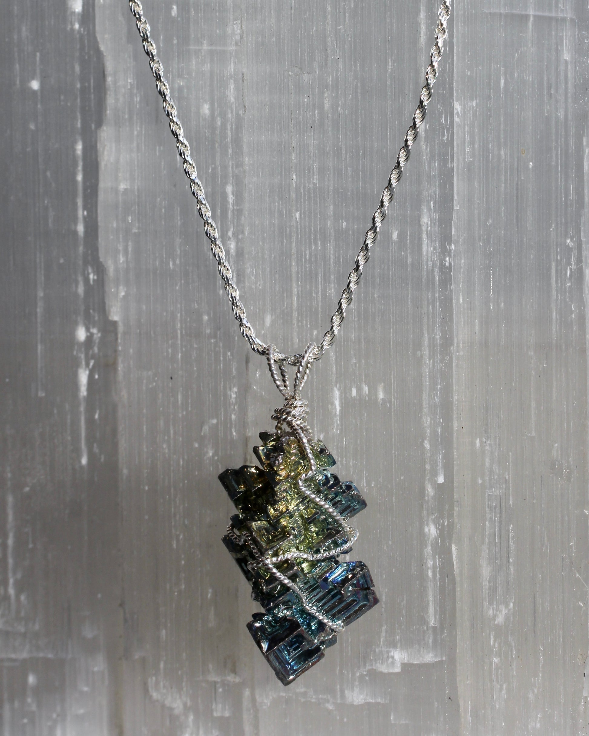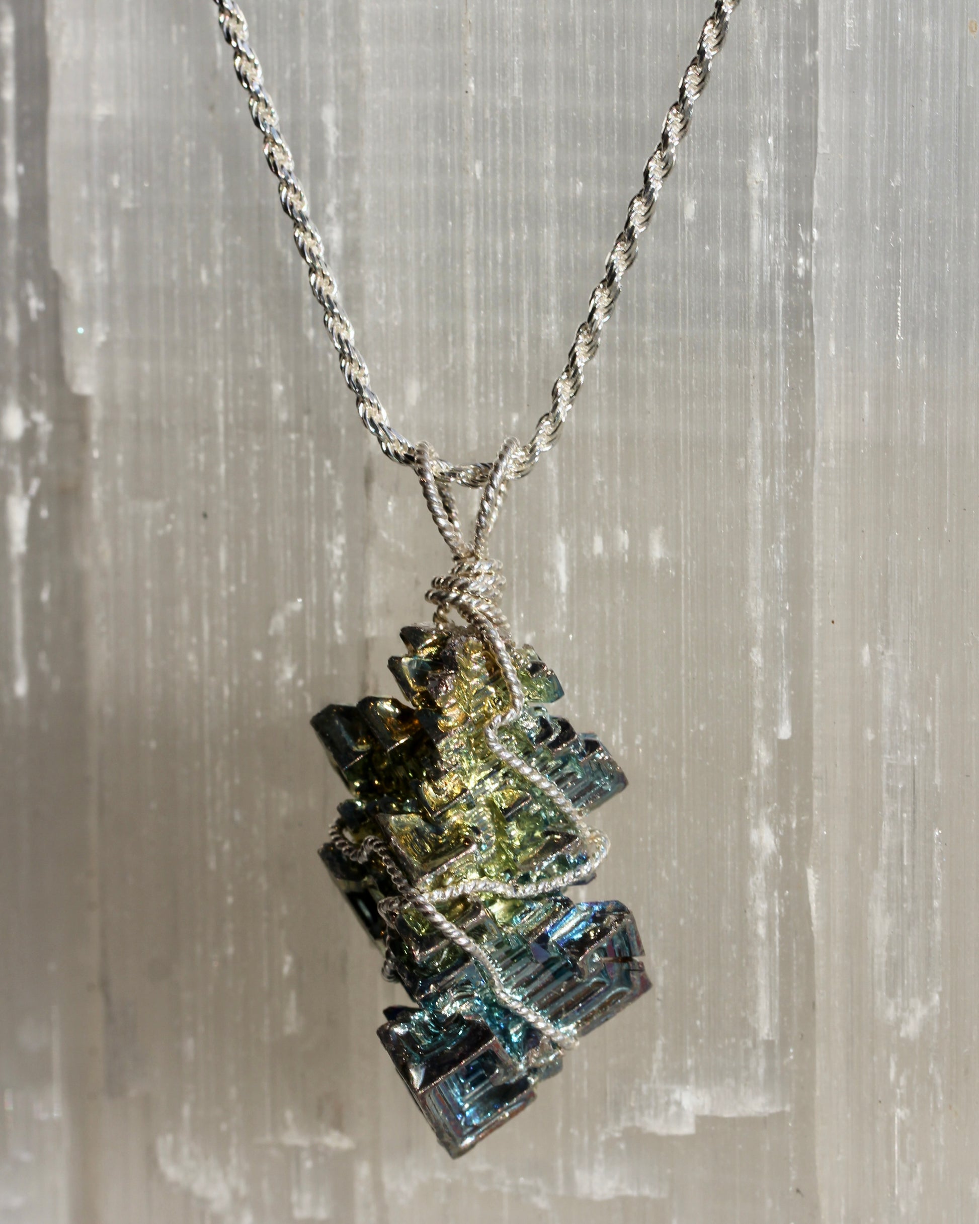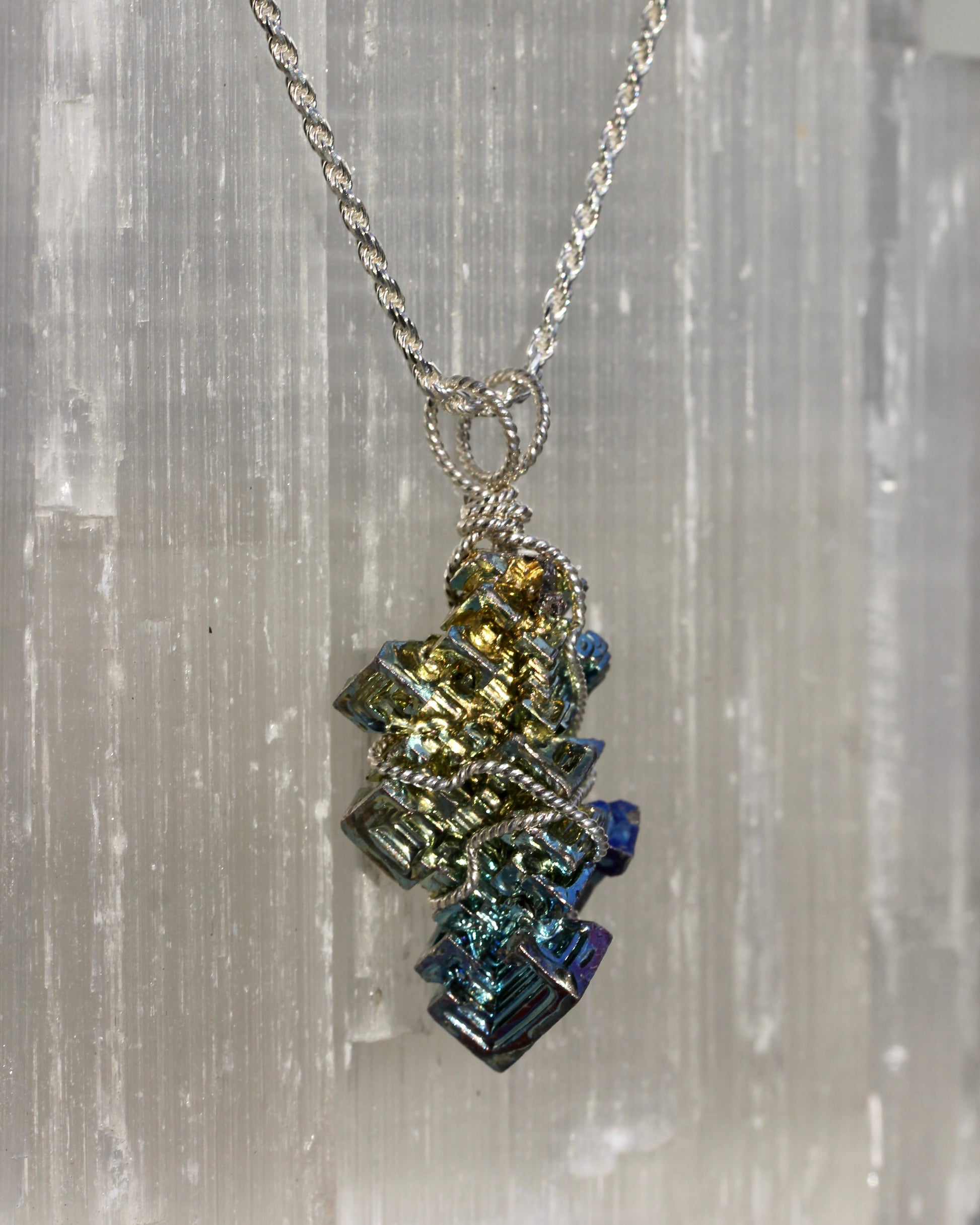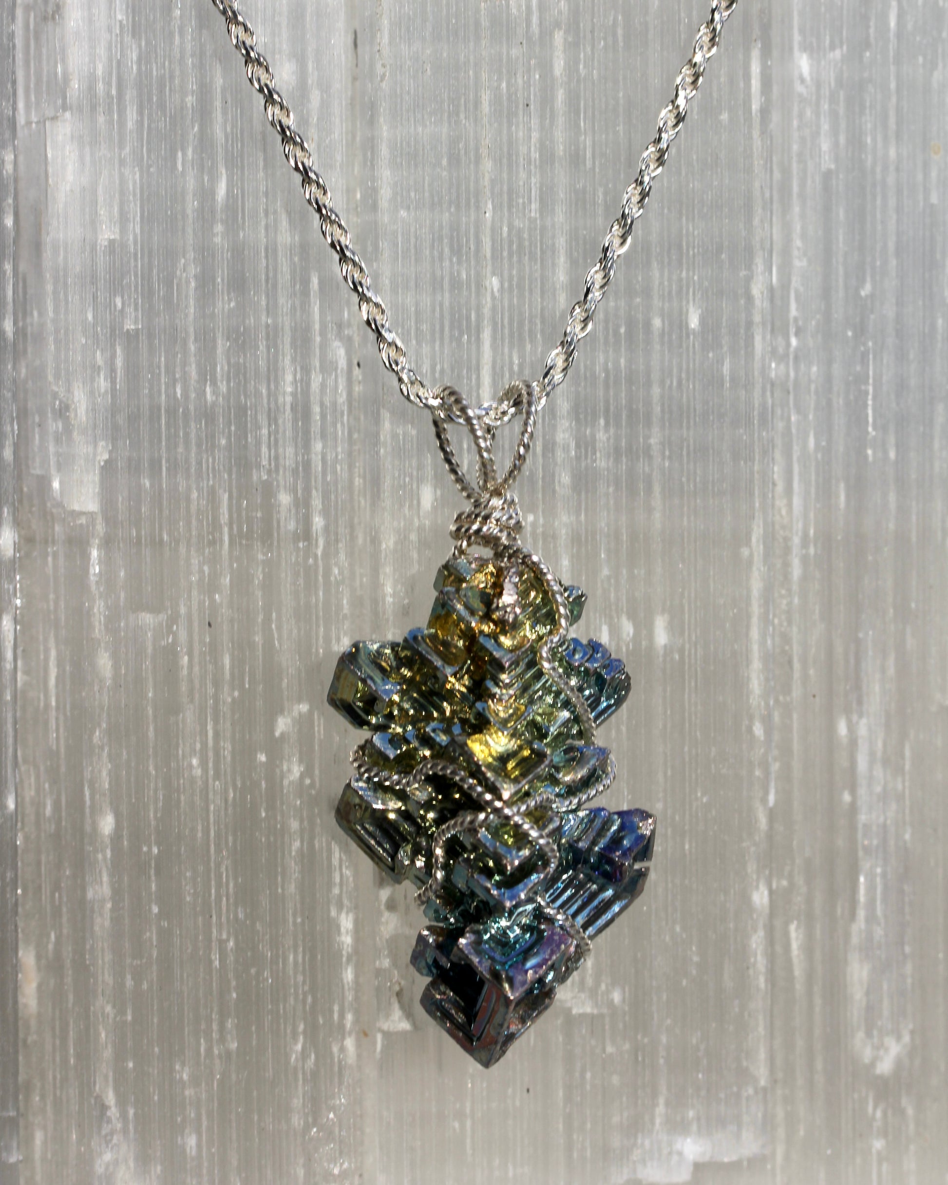 This fine specimen of bismuth is suspended by sterling silver wire with a twisted texture. The pendant measures 18mm in width and has a length of 40mm, which includes the gold bail. In this listing you can choose to buy the pendant alone or add the chain pictured. This is a sterling silver, rope chain with a length of 18".