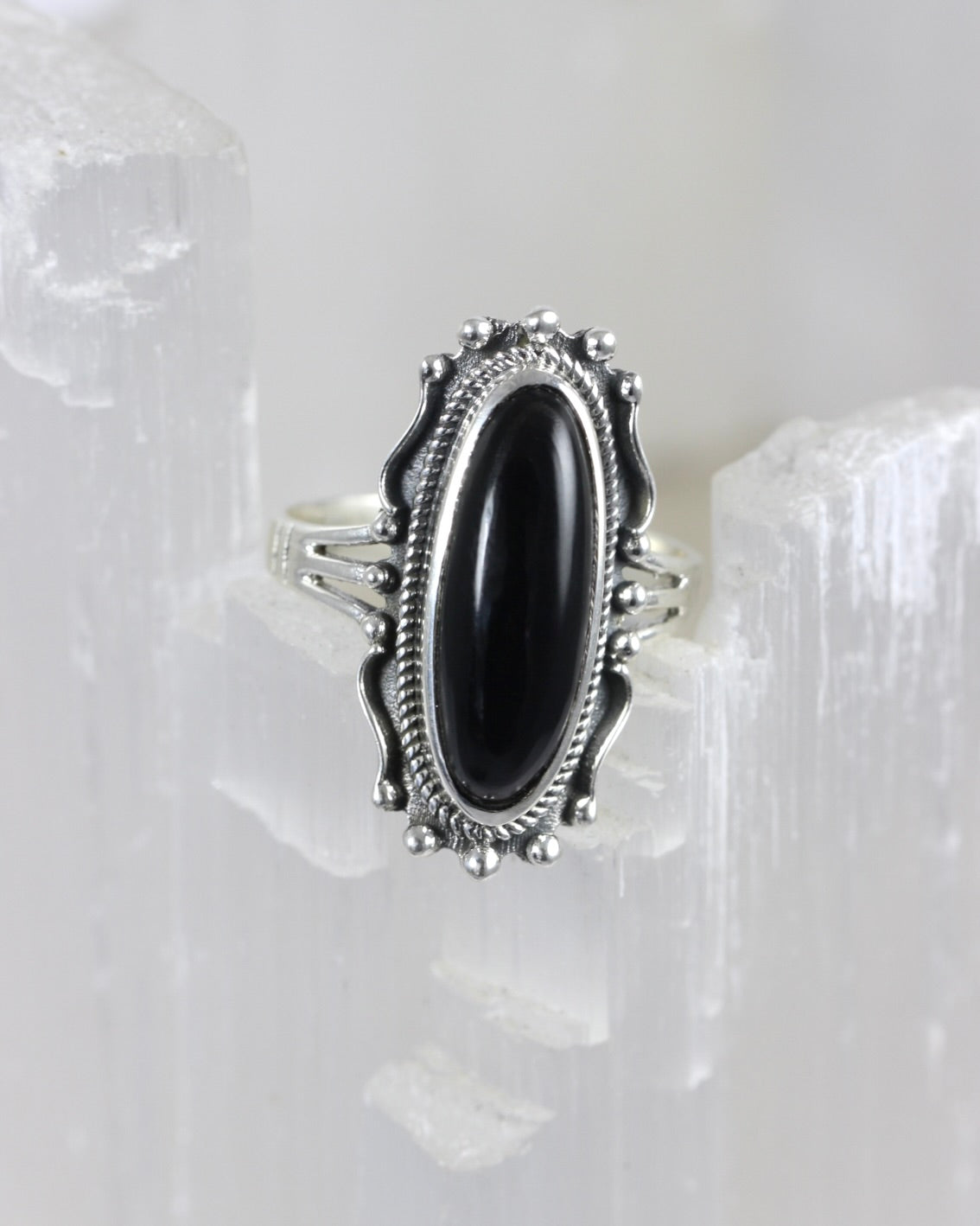 This ring features a polished black onyx gemstone in an oblong shape set in sterling silver. Textured silver details accent around the stone. The stone measures 6mm x 22mm. This ring is a size 10.