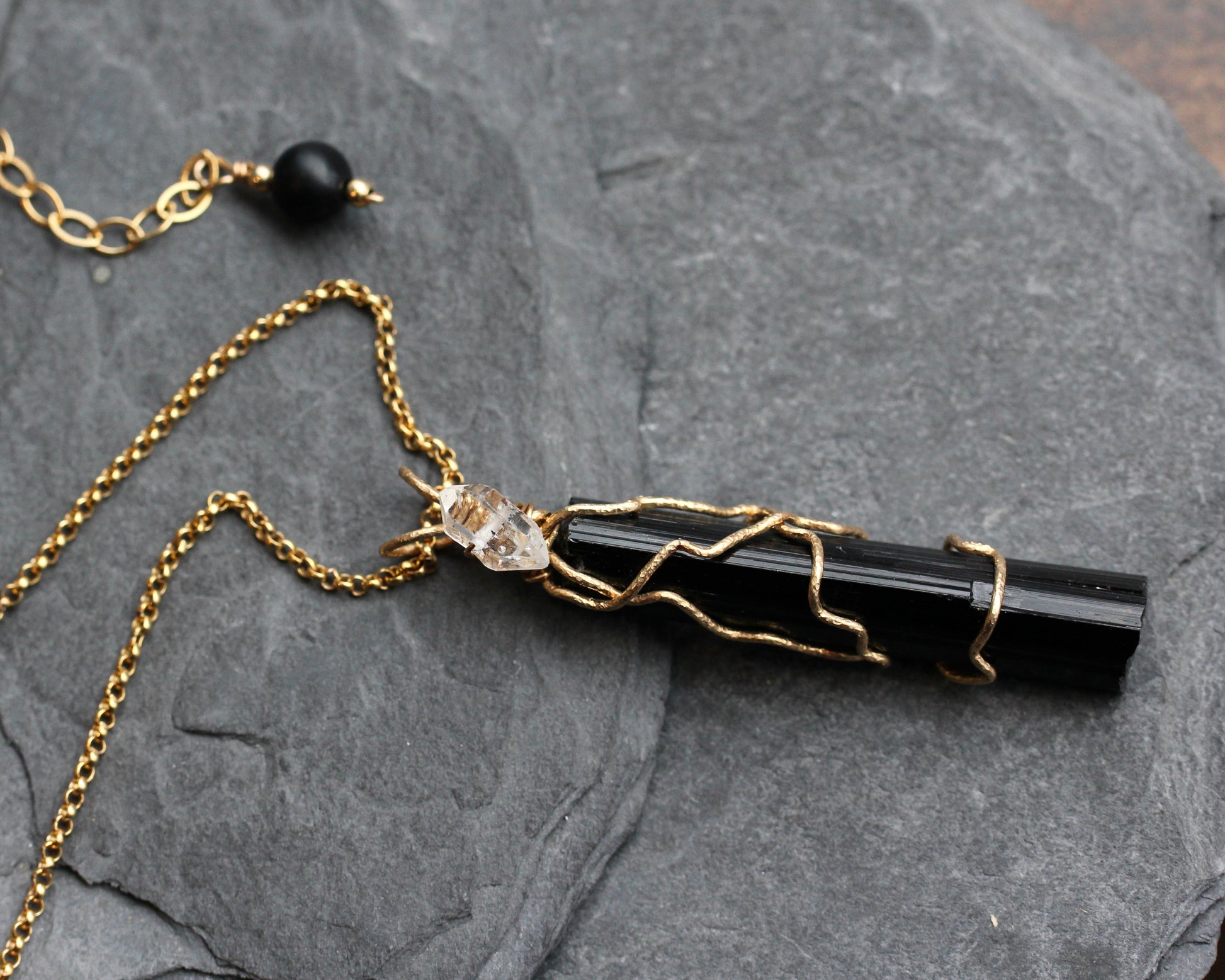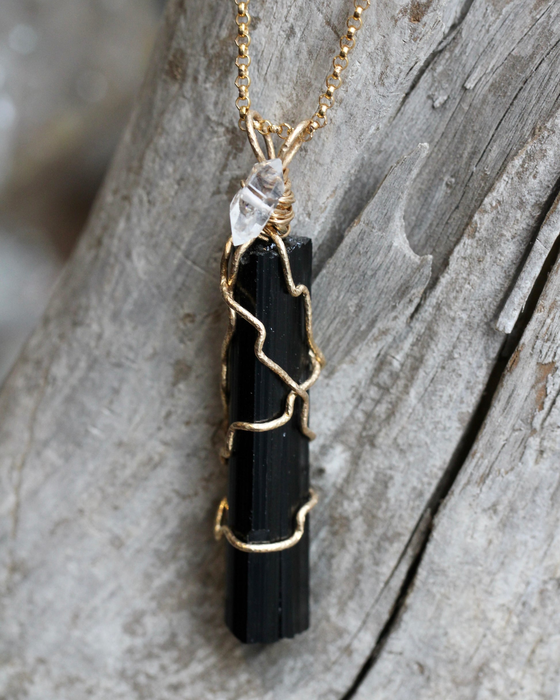 This piece features a large shard of black tourmaline. Wire wrapped in a gold filled wire, this precious stone is accented with a Herkimer Diamond. The pendant measures 10mm x 50mm (2 inches), which includes the gold bail. In this listing you may choose to purchase only the pendant or add the chain shown in the pictures. This is a gold filled, rolo chain with a length of 18" adjustable up to 20".