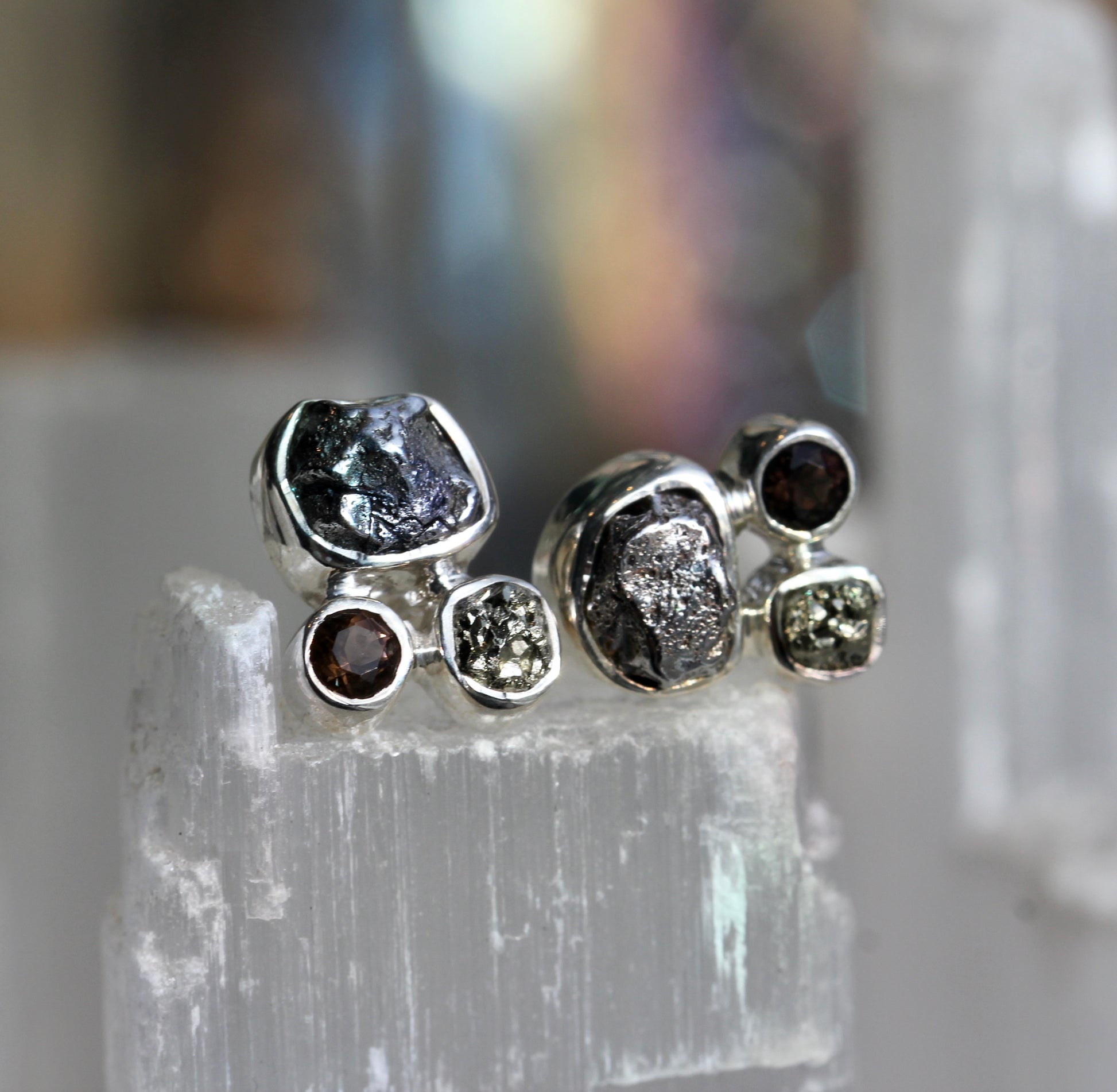 These adorable, post earrings feature meteorites accented with pyrite and faceted, smokey quartz, set in sterling silver. They measure about 11mm in diameter.