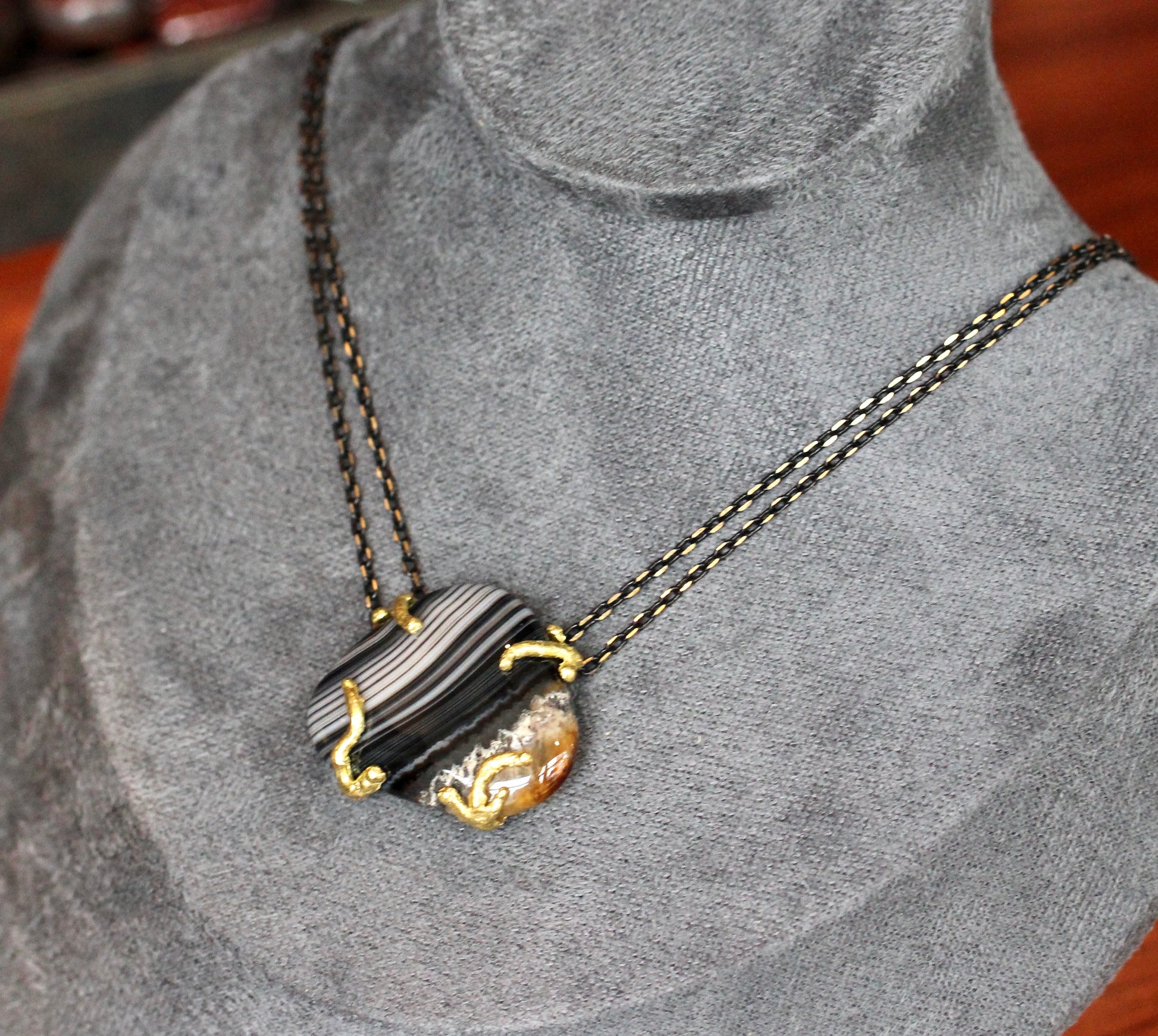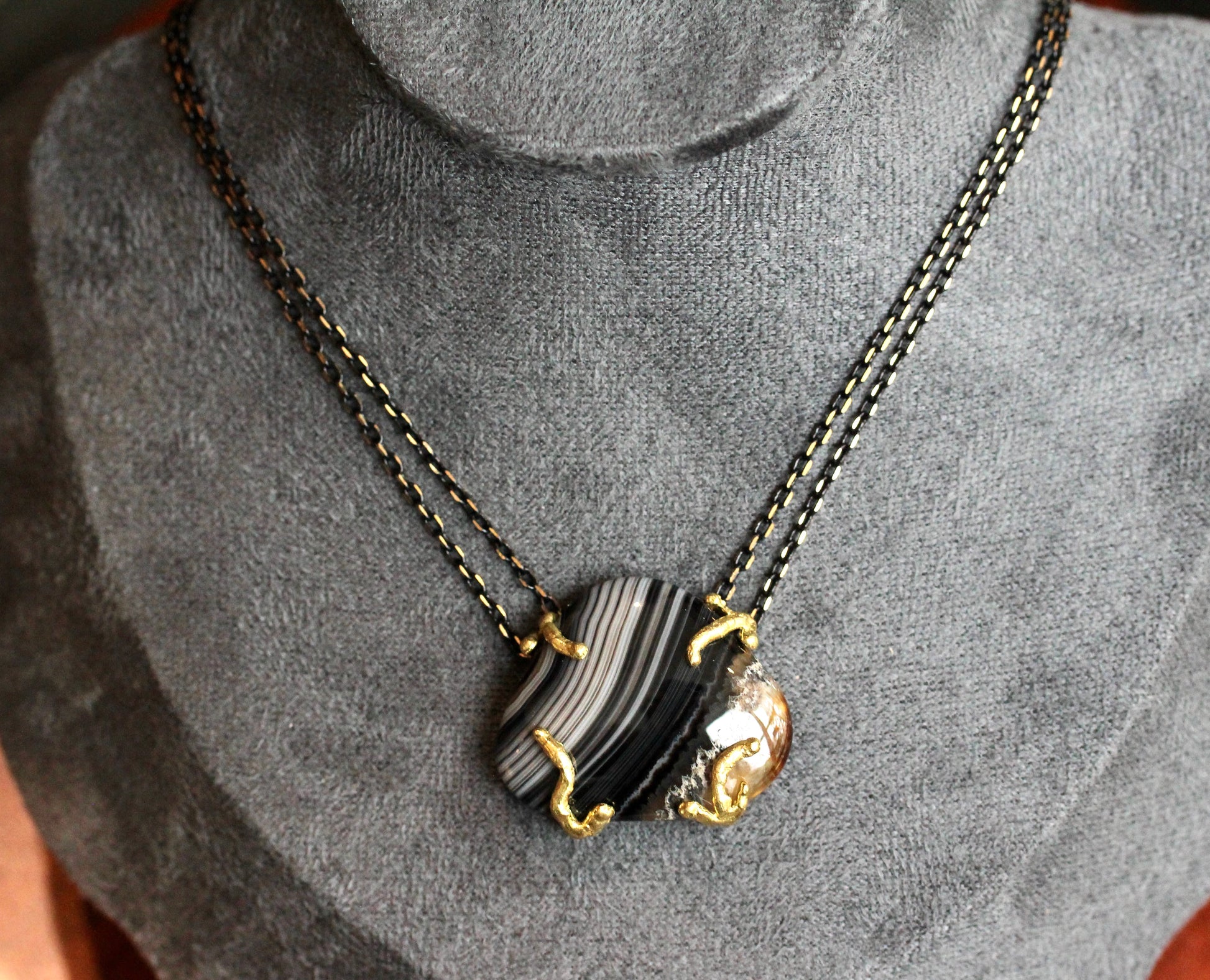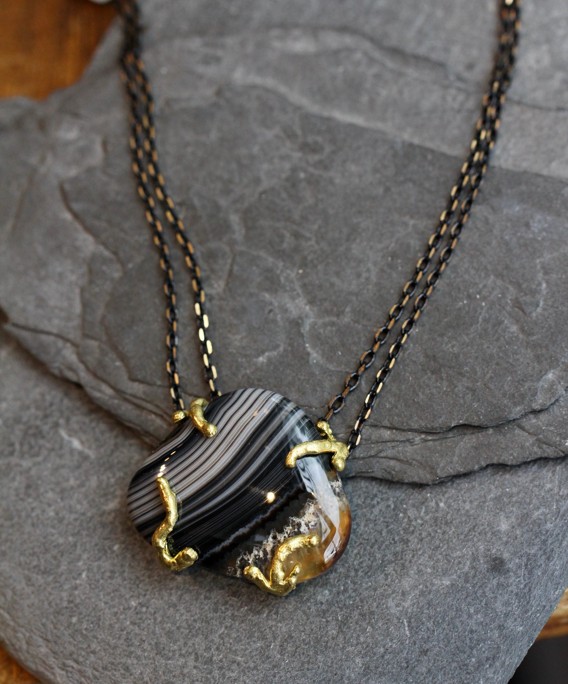 This Necklace features a banded agate stone in a smooth, freerform shape. It sits in a raw brass setting and is suspended between double chains of brass that is partially plated black for a very cool black and gold effect. This center stone measures 1" x 1 1/4". The length of the necklace is 16 3/4".
