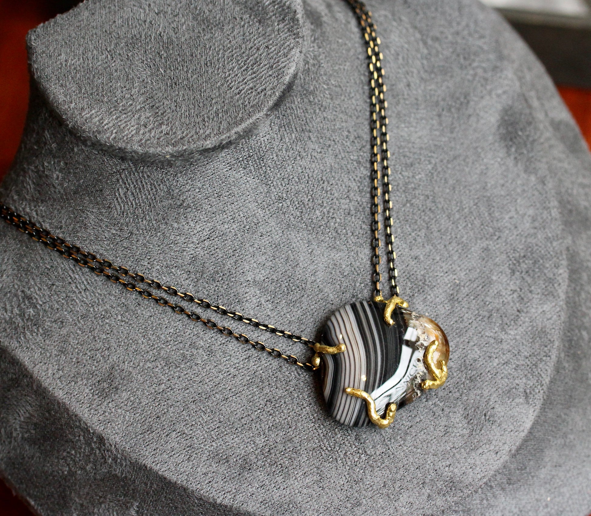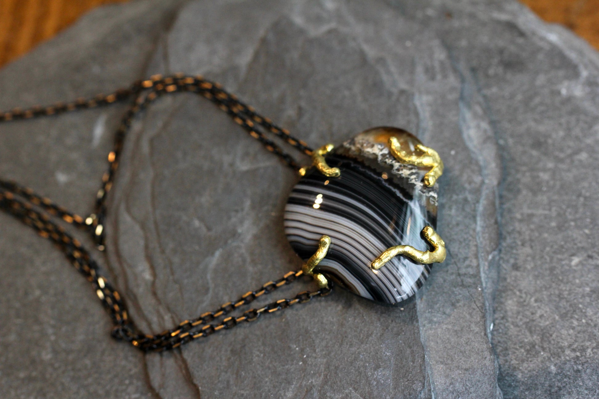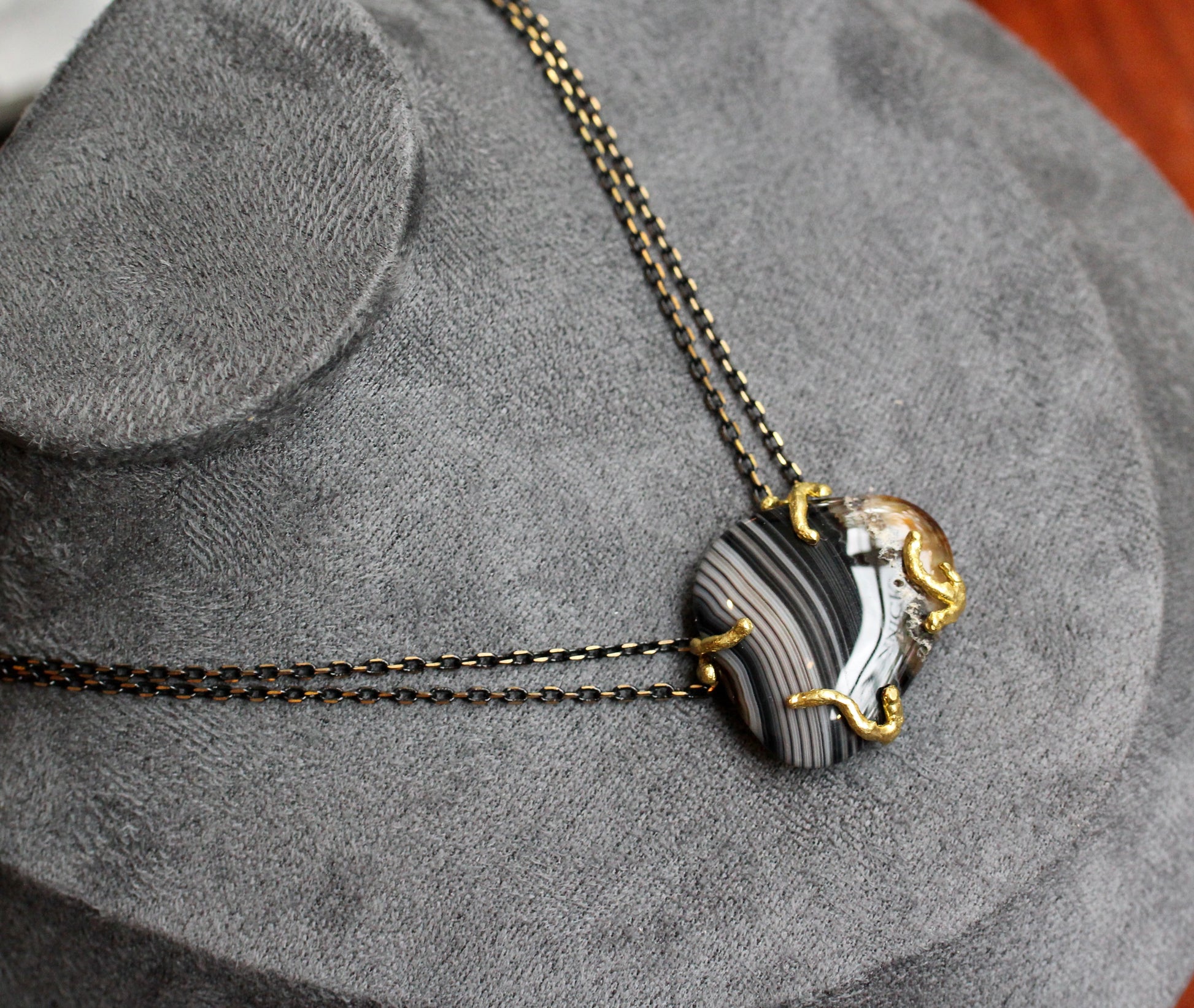 This Necklace features a banded agate stone in a smooth, freerform shape. It sits in a raw brass setting and is suspended between double chains of brass that is partially plated black for a very cool black and gold effect. This center stone measures 1" x 1 1/4". The length of the necklace is 16 3/4".