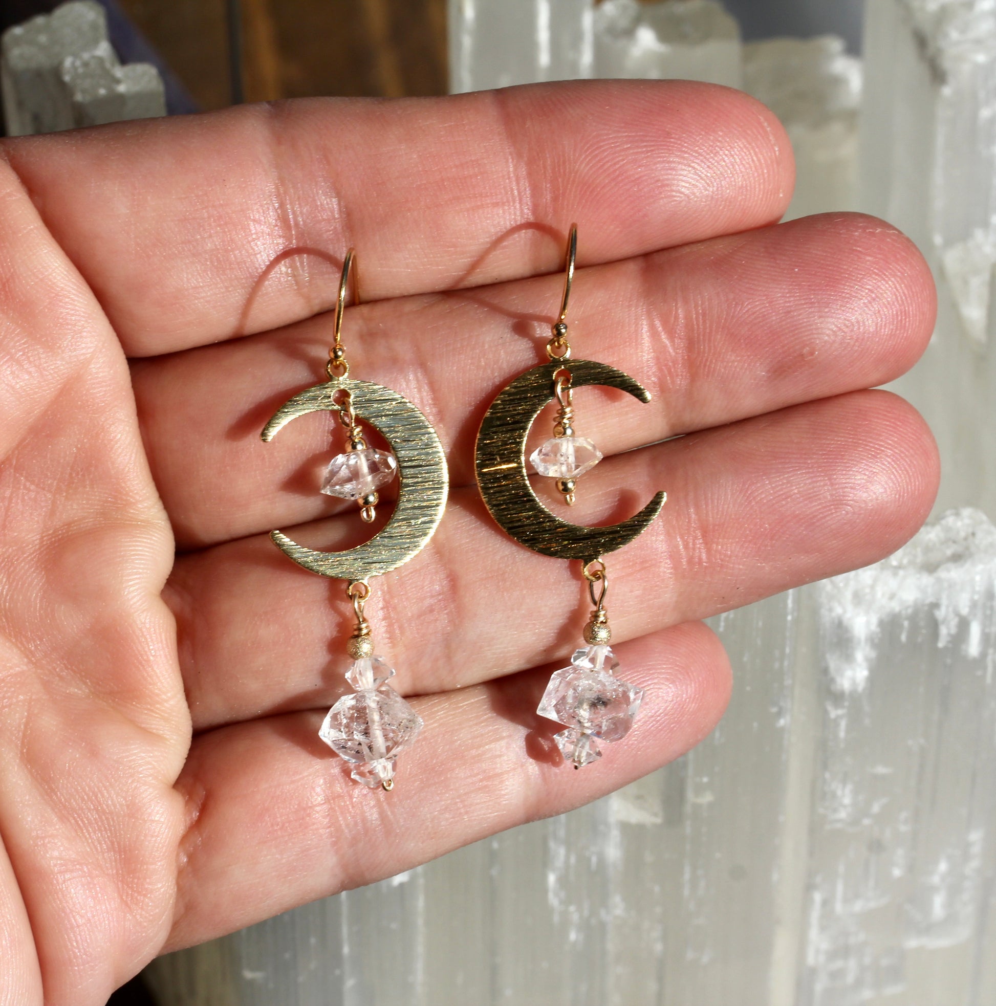 These fun earrings feature double terminated quartz crystals from Pakistan and small Herkimer diamonds that dangle from raw, brass, moons with a brushed texture. They have a width of 19mm and hang 35mm in length from gold filled ear wires.