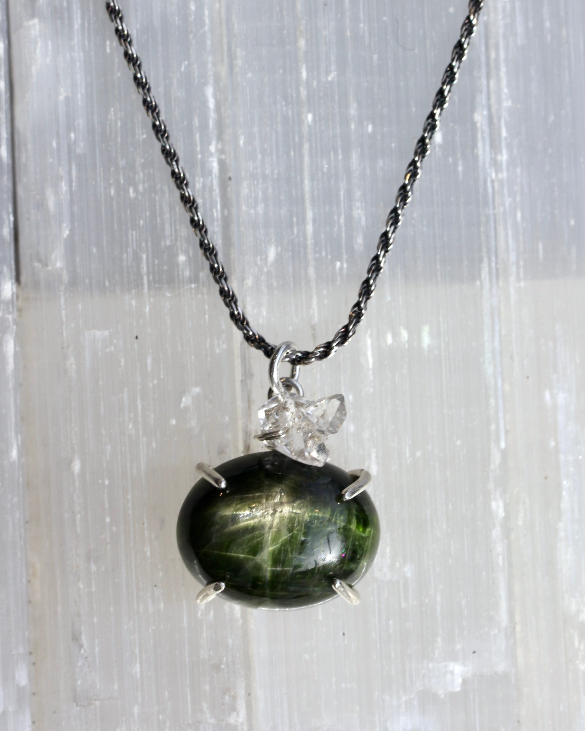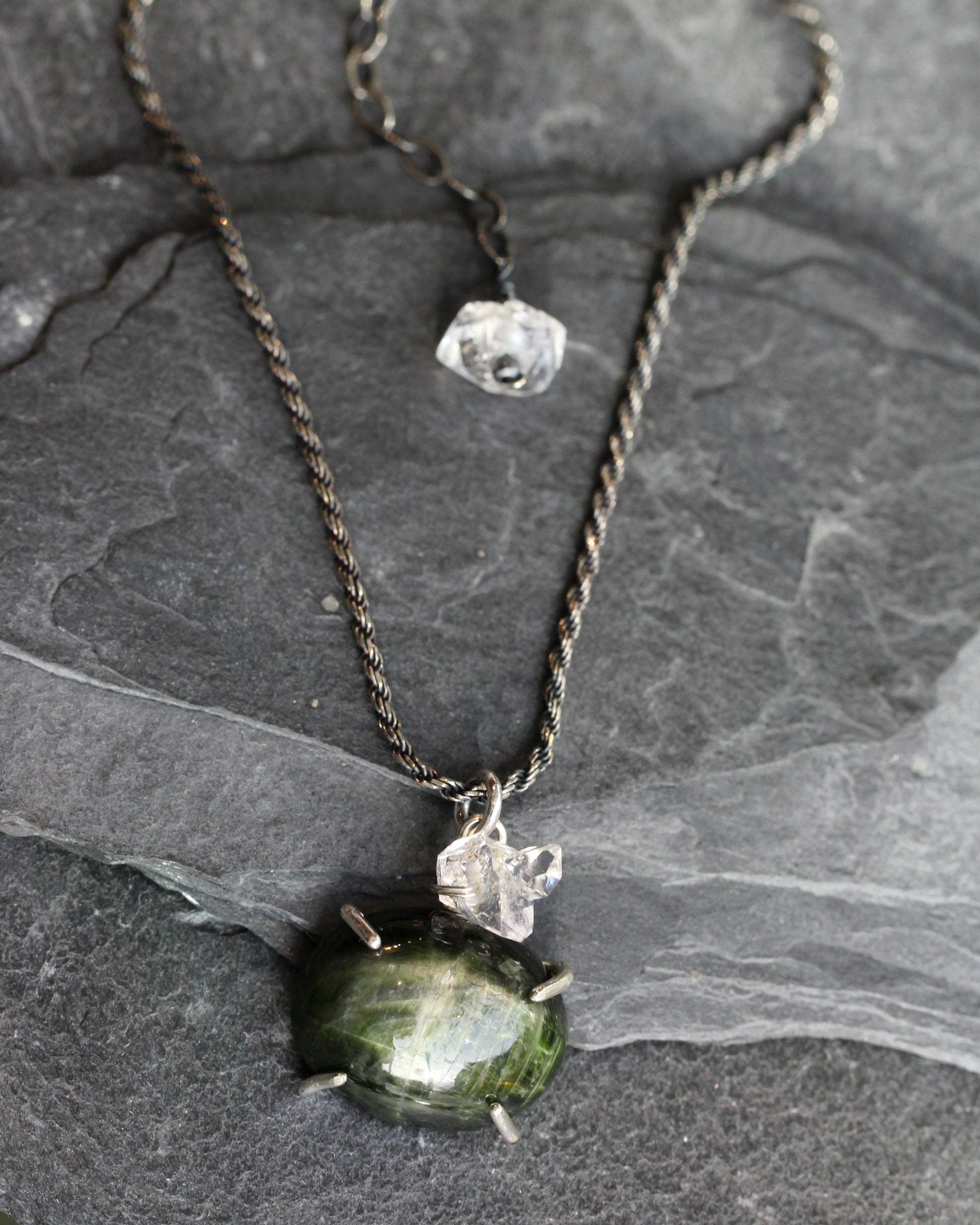 This necklace features an oval cut cabochon of chrome diopside. It has a rich, forest green color with a chatoyant shimmer. The stone sits in a sterling silver, prong setting and is accented with a Herkimer diamond crystal. The pendant measures 18mm x 25mm and slides around an oxidized, sterling silver, rope chain. The length of the chain is 16" adjustable up to 18". Another Herkimer diamond crystal accents the end of the chain.