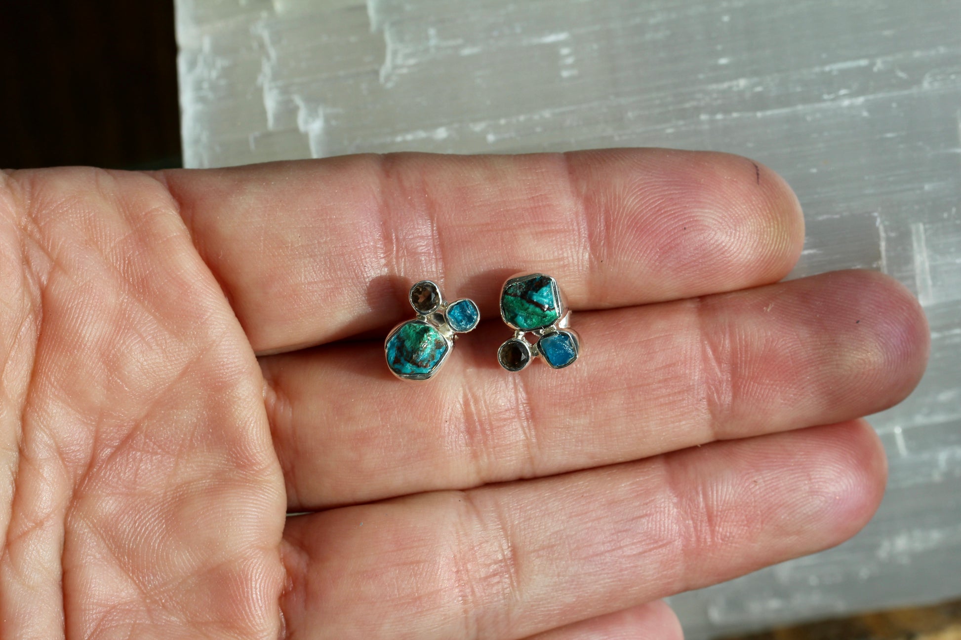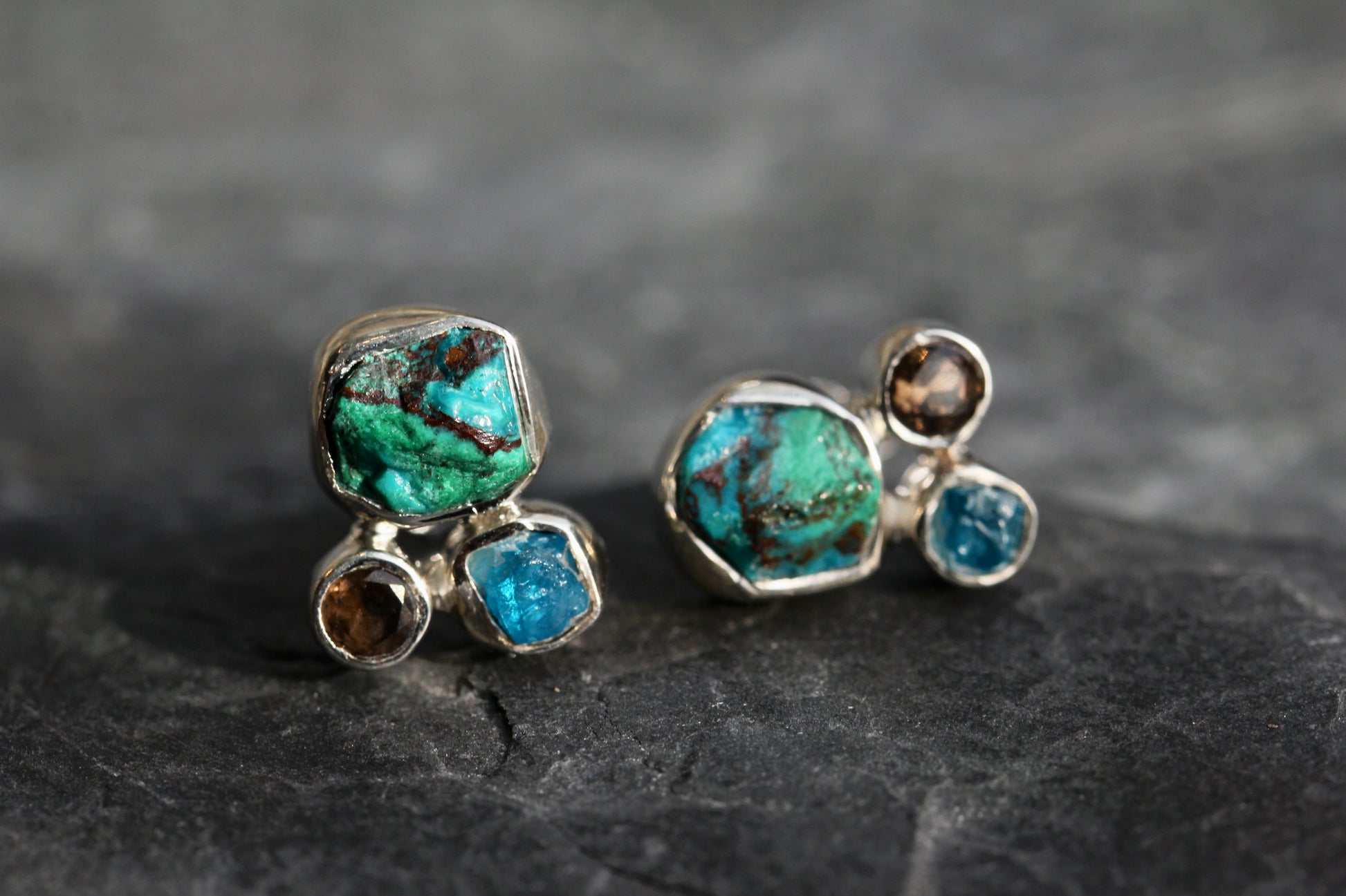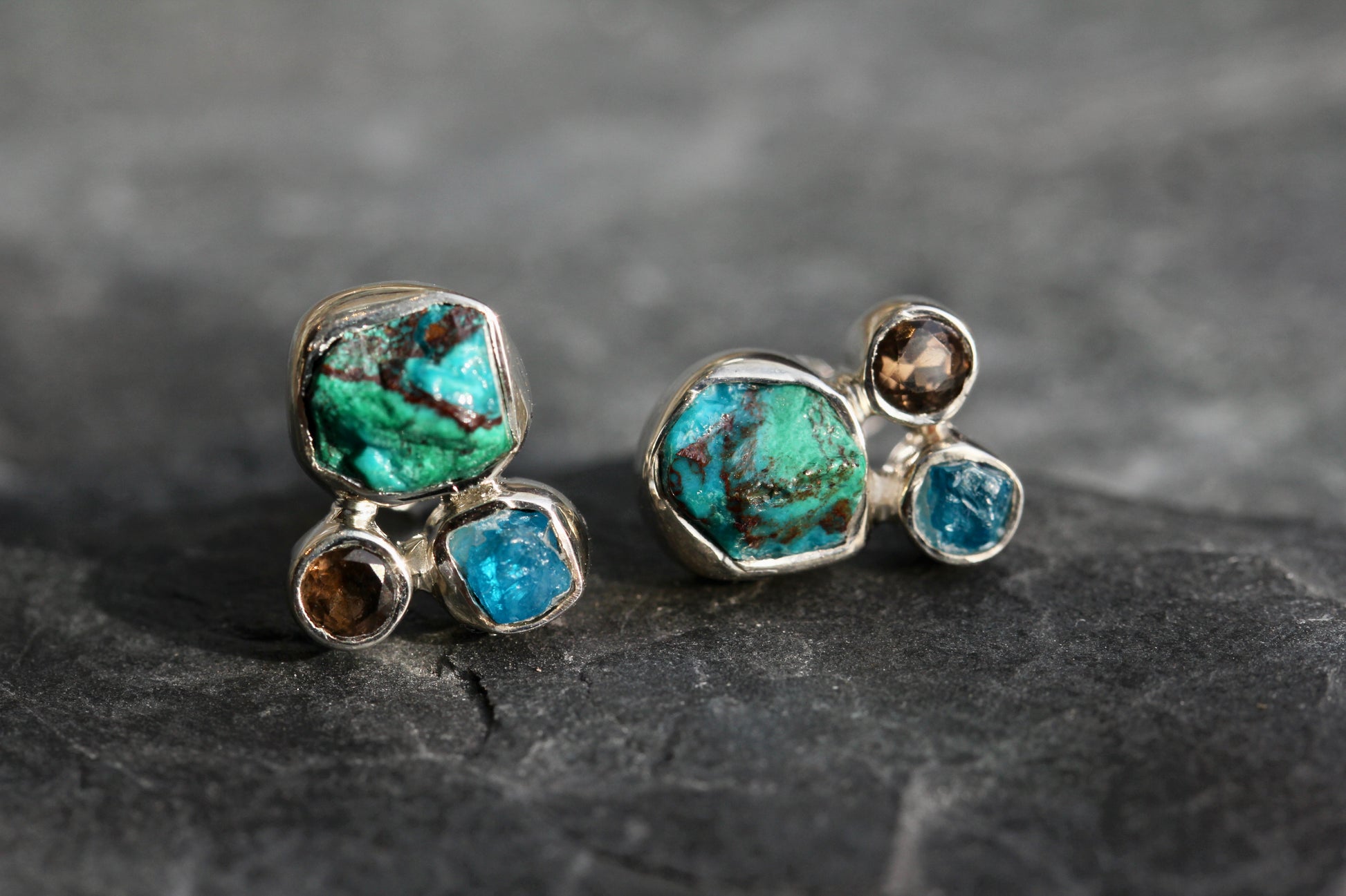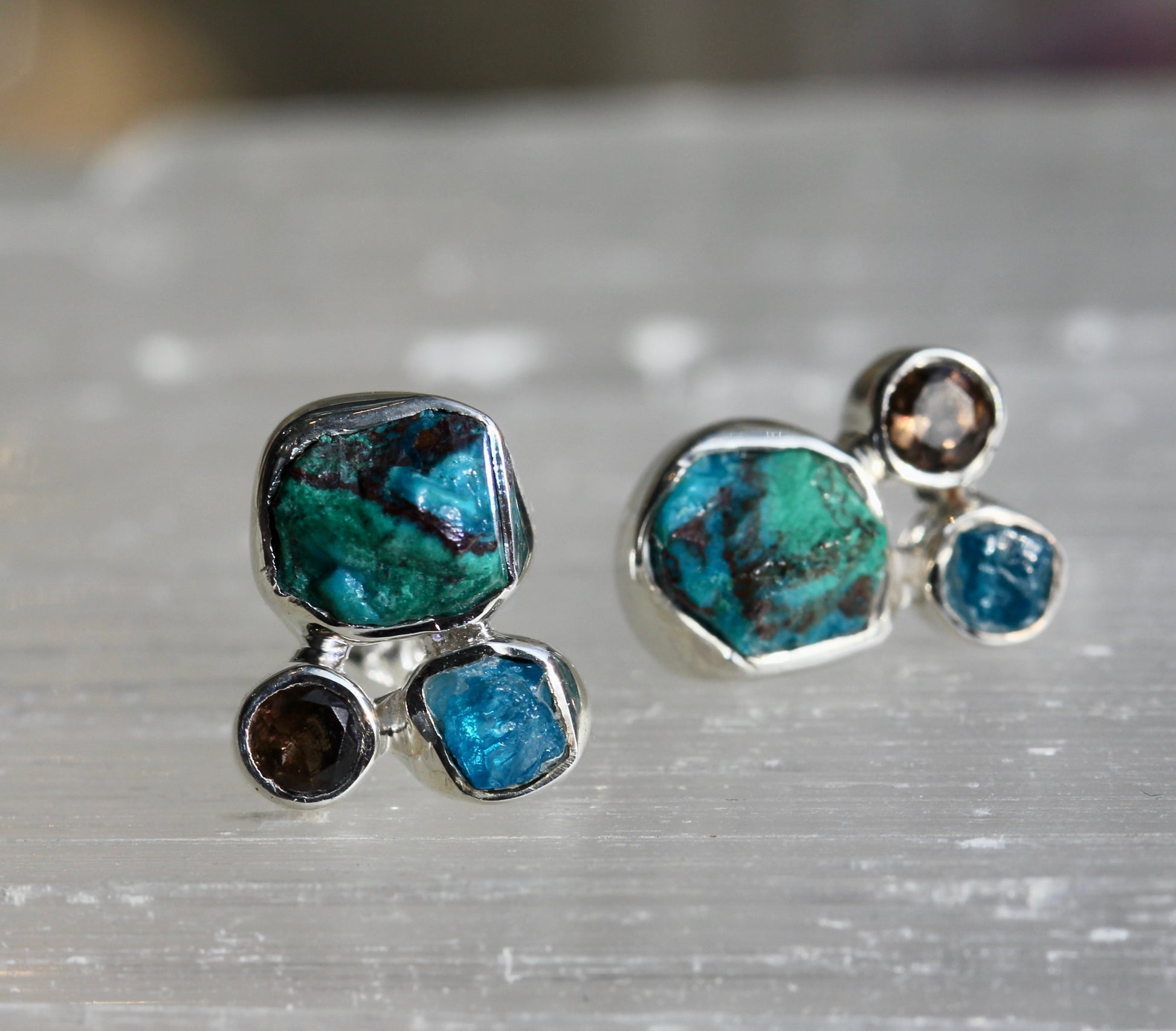 These adorable, post earrings feature raw Chrysocolla stones accented with smokey quartz and rough, blue apatite, set in sterling silver. They measure about 11mm in diameter.