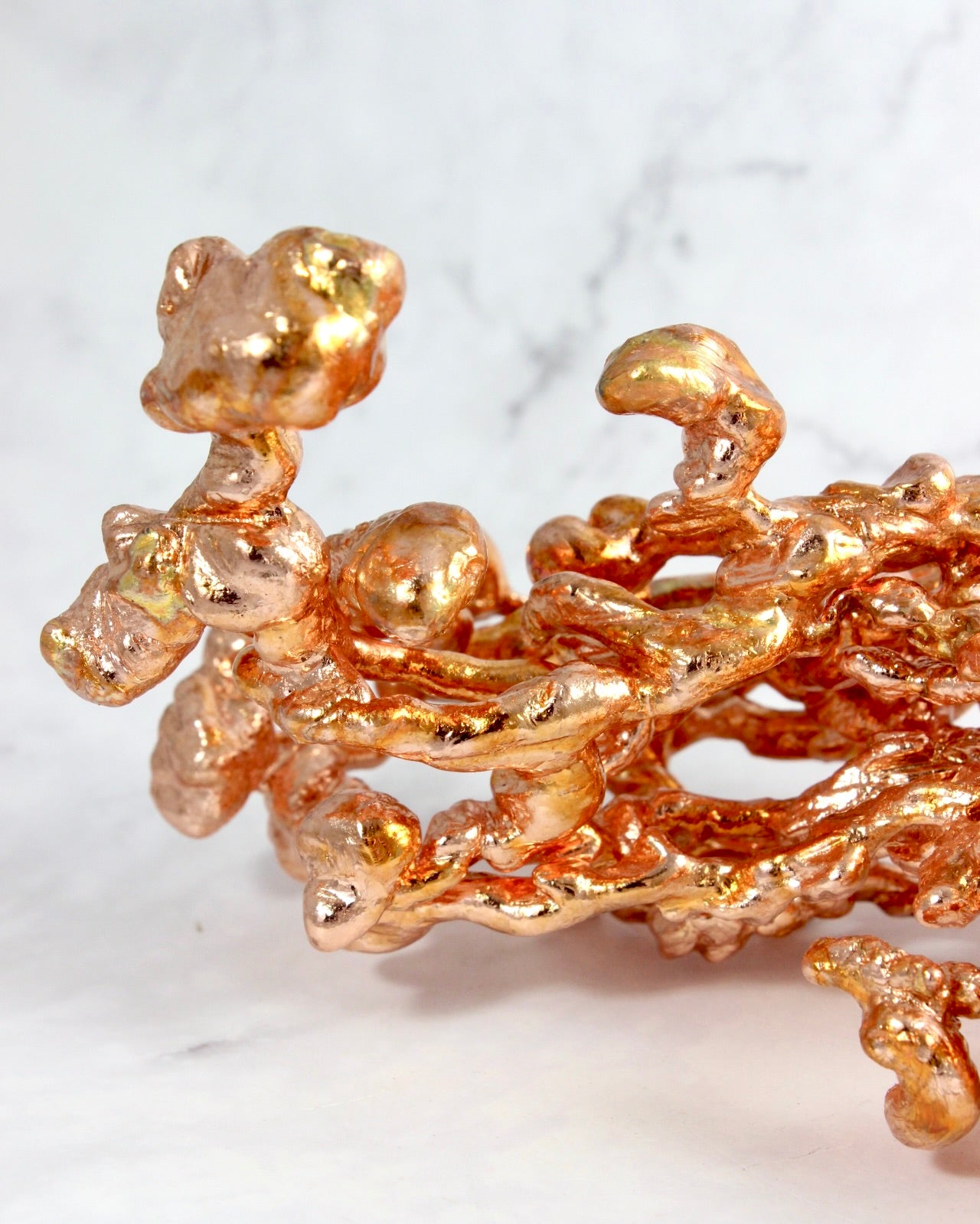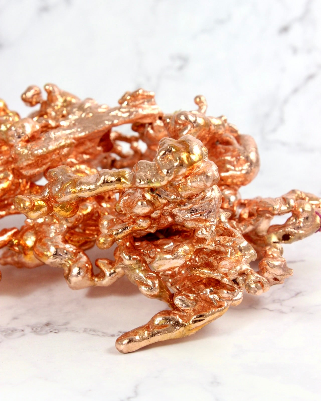 Native copper is used to form these interesting sculptures. Molten copper at 2200 degrees F is poured into water soaked straw. The straw forms the shape, then burns away, and the copper forms solidify in the cool water.