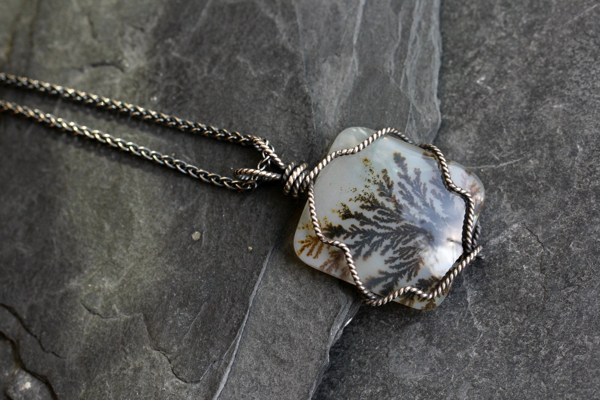 This necklace displays dendritic agate at its best. This high quality, cut stone is a variety of agate which is valued for its inclusions. Agate is host to maganese, which crystalizes inside the stone much like ice or frost does on a window. It creates branch, like patterns with gradients of color that are unique to each stone. This unique beauty is suspended by sterling silver wire which was then oxidized to bring out its rope like texture. The pendant measures 20mm in width and 30mm in length, which includes the silver bail. The pendant slides around an oxidized, sterling silver, wheat chain with a length of 18" adjustable up to 20".