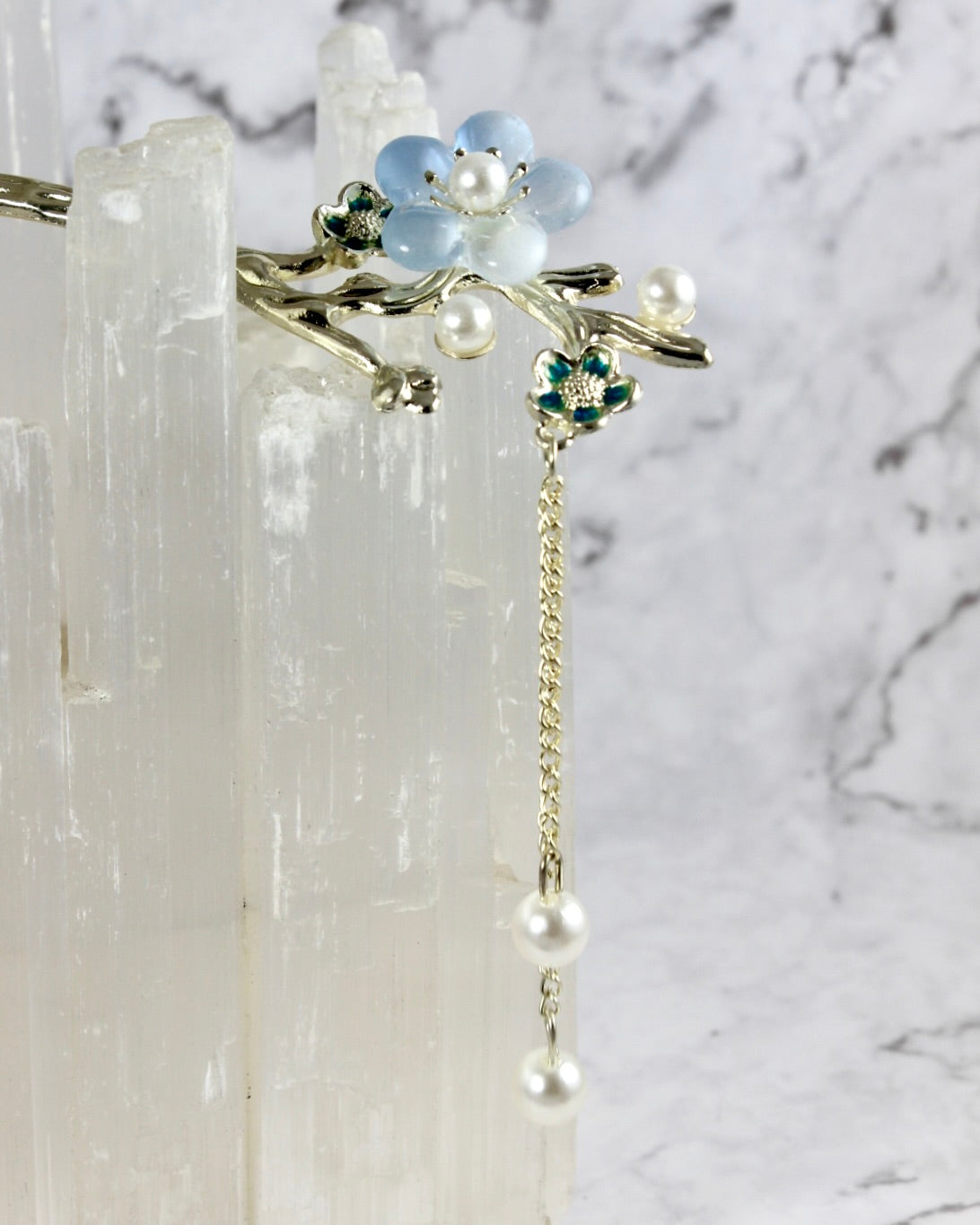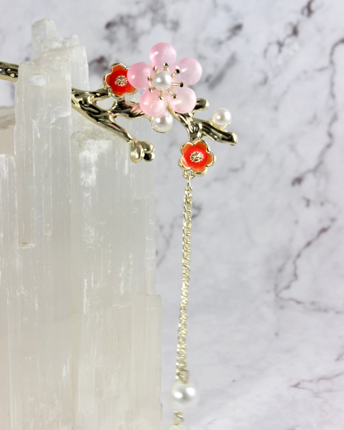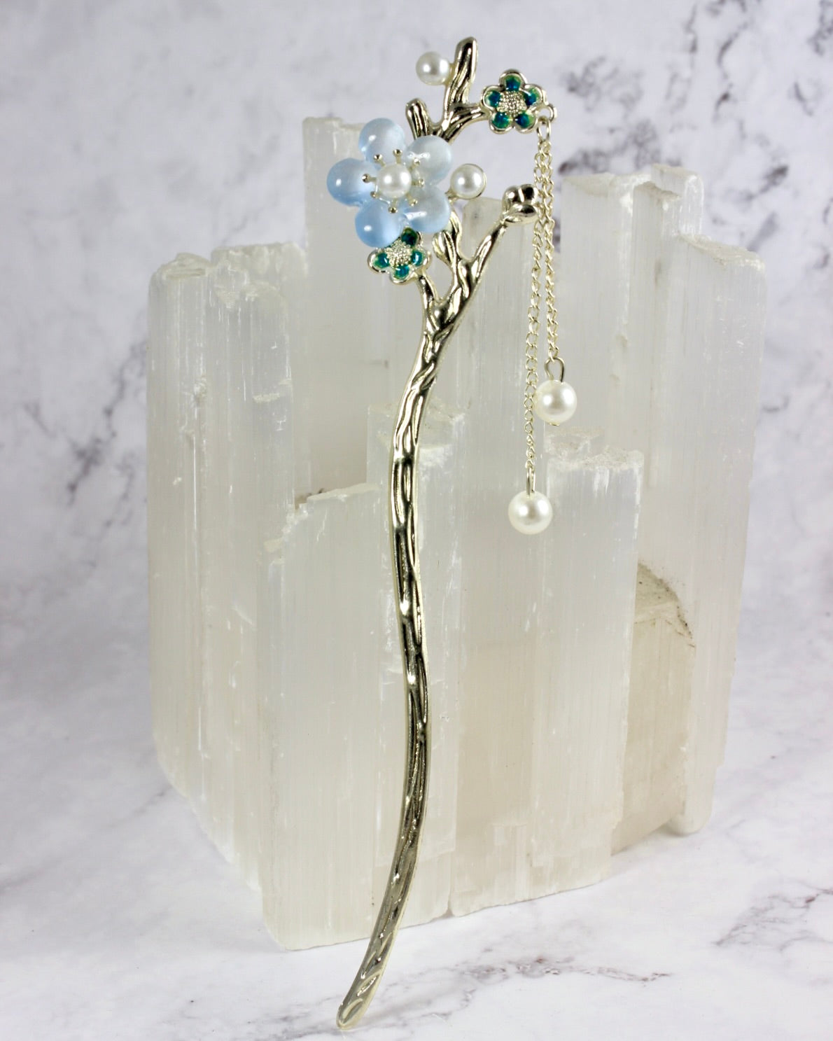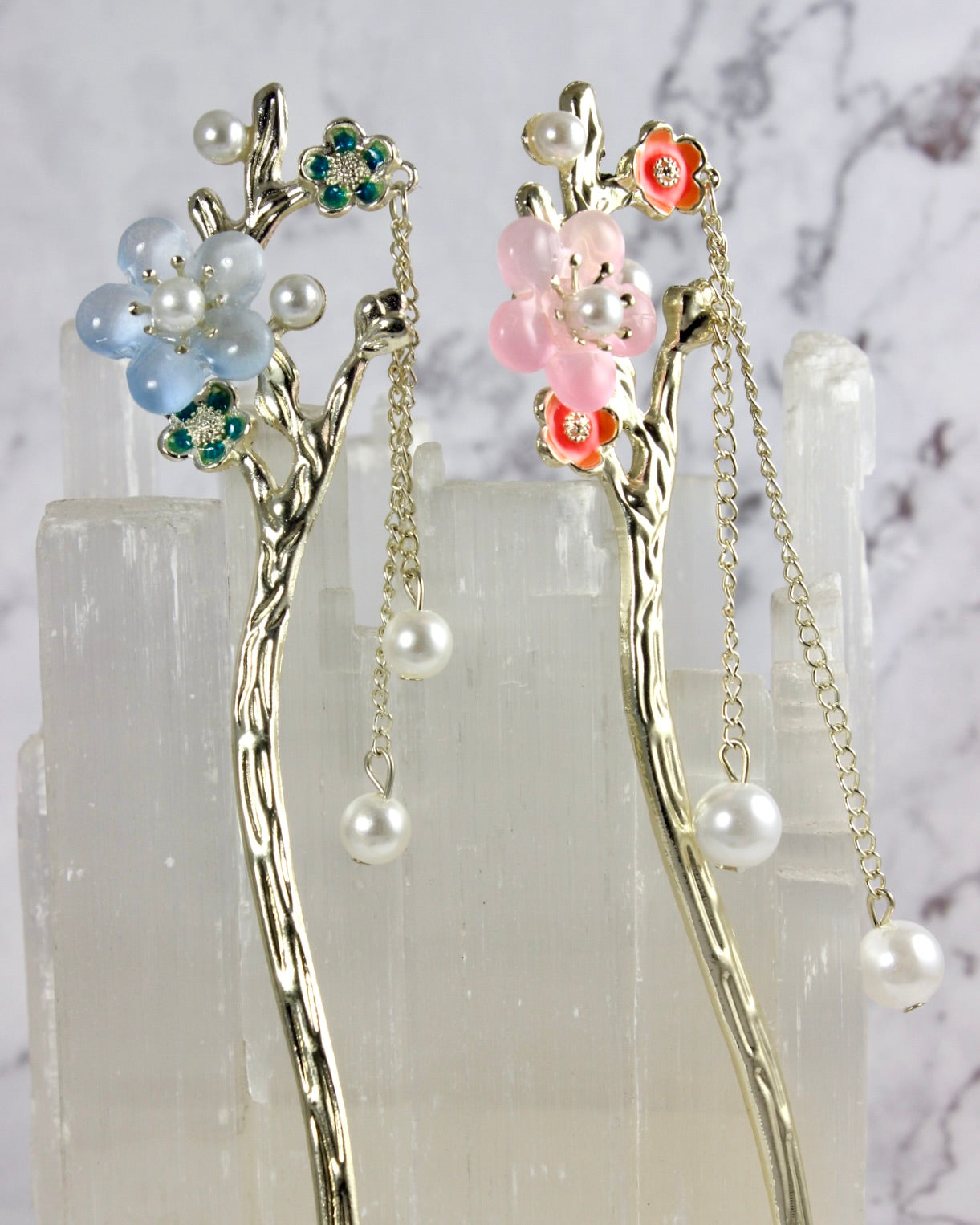 These fun hair sticks are part of our collection of hair accessories that we carry mostly in our brick and mortar store. In this listing you can choose between 2 different hair pins - one in blue and one in pink. Both come on a gold toned hair stick with pearl like beads dangling from the floral design. The hair sticks measure about 6 1/2".