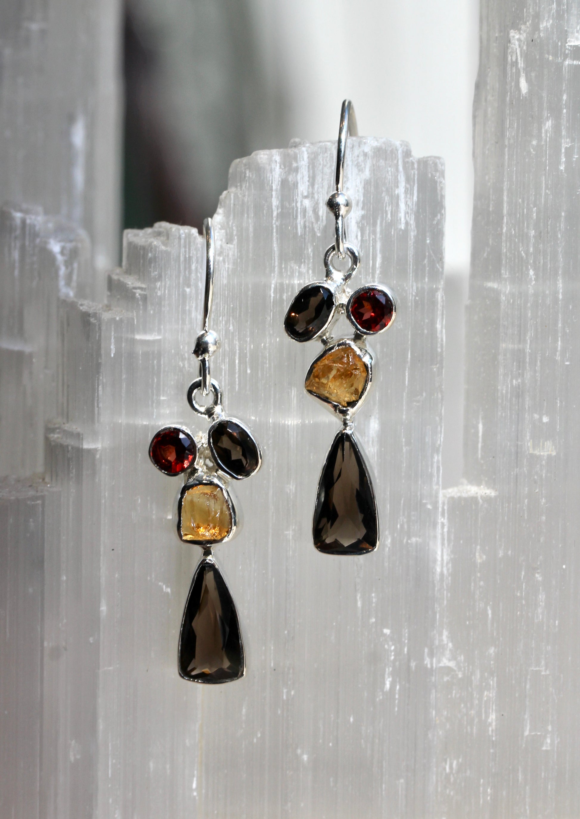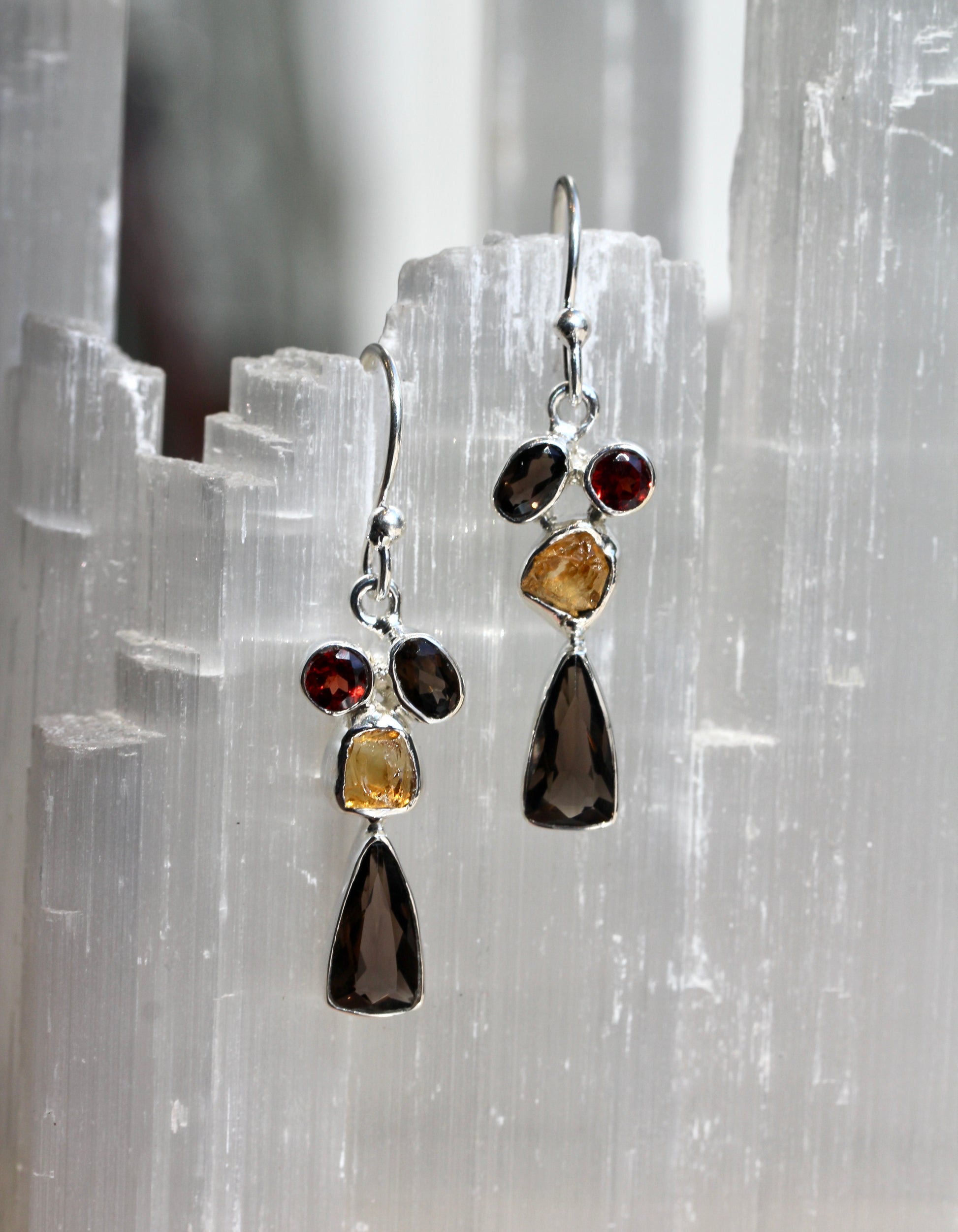 These earrings display smokey quartz gems accented with faceted garnets and raw citrine. They measure 10mm in width and hang 25mm in length from sterling silver, ear wires.