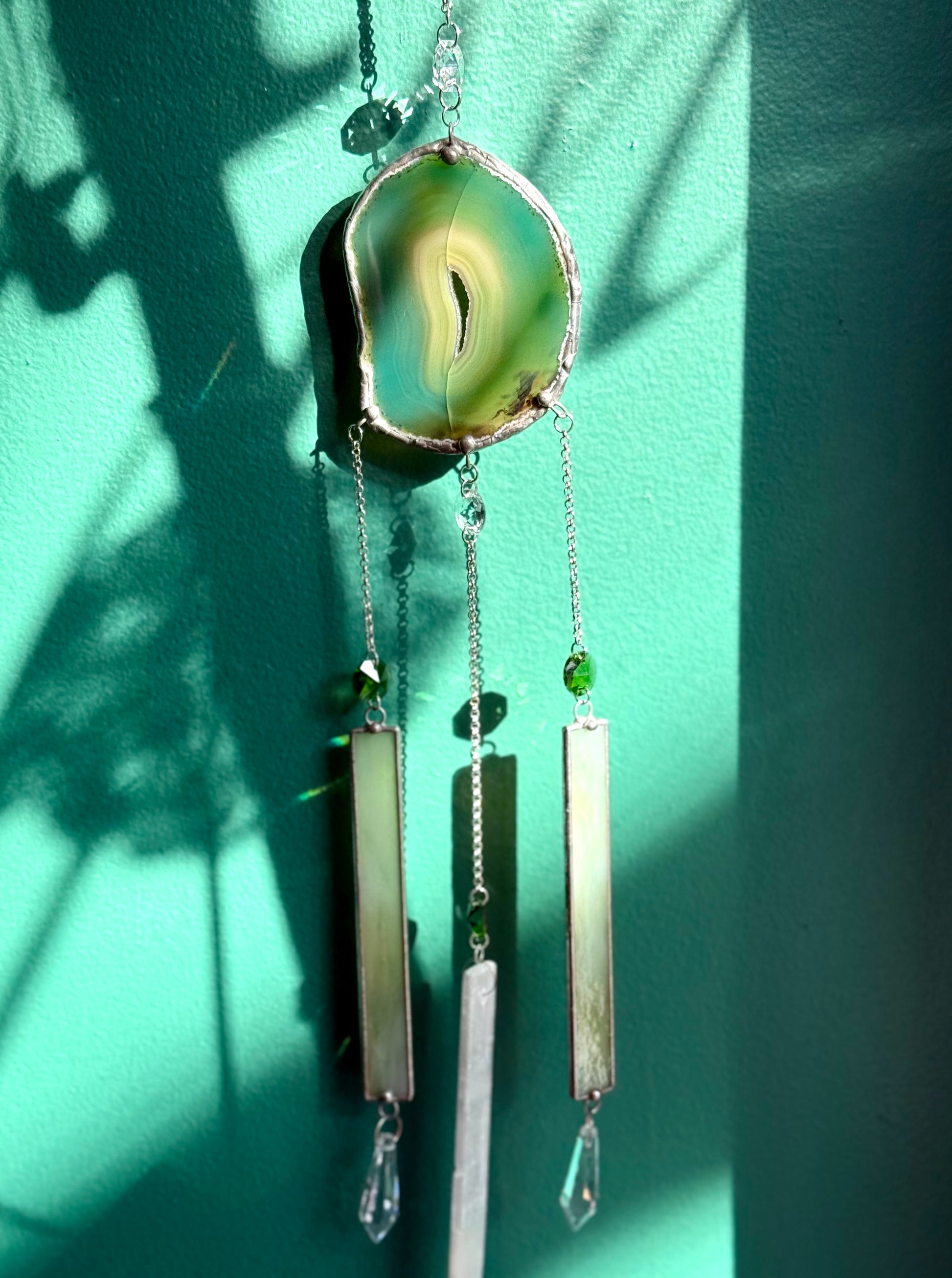 A natural slice of agate is the highlight of this exquisite sun catcher. Abstract green stained glass and Czech Preciosa crystal prisms hang from the agate, linked together with silver plated chain. A stick of selenite hangs at the bottom of this beauty, This piece of hanging art refracts the light at all angles, adding warmth, sparkle and dancing rainbows to your space. The agate center piece measures about 3" in width. The full length of the mobile is 21".