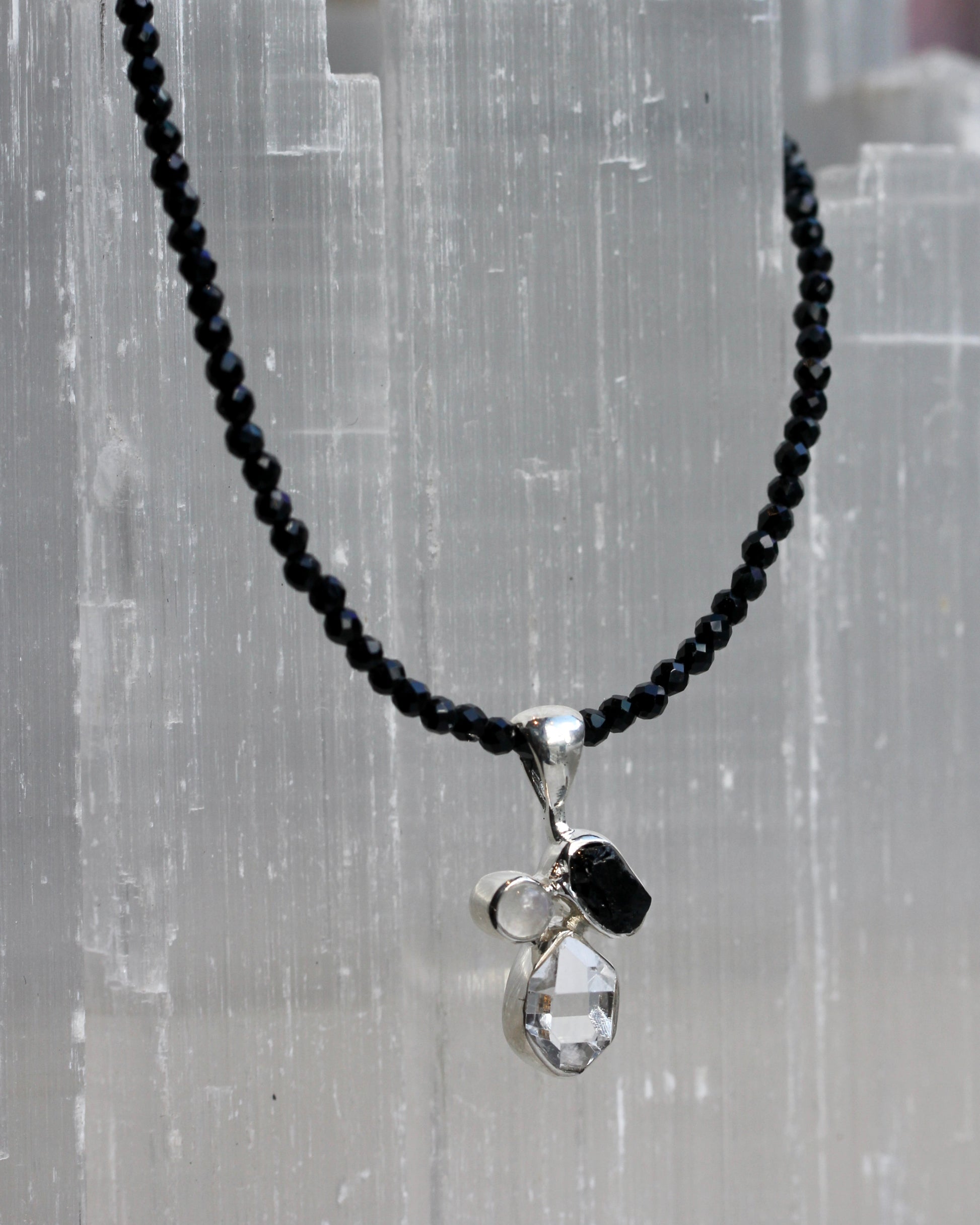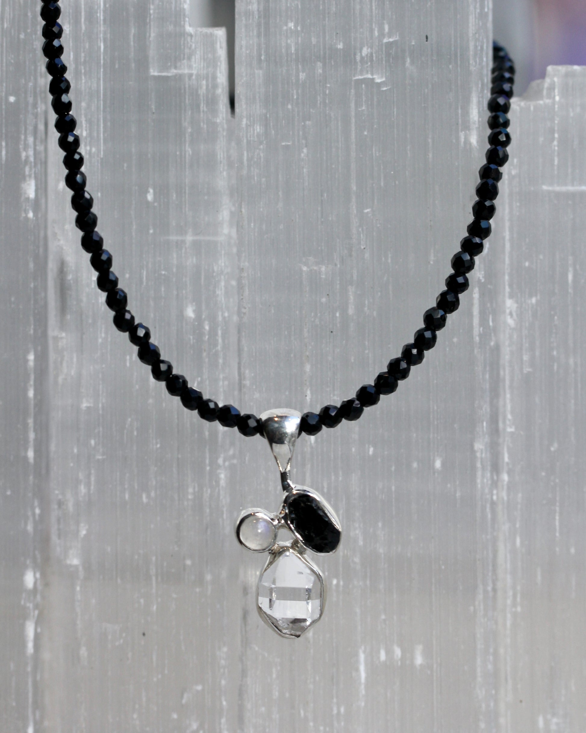 This necklace features a unique pendant of a Herkimer diamond crystal accented by black tourmaline and a rainbow moonstone. Bezeled set in sterling silver, this pendant slides around a beaded necklace of 2mm, black spinel, faceted beads. The necklace length is 17 1/4" adjustable up to 19 1/4". Another crystal of Herkimer diamond accents the end of the extension chain.