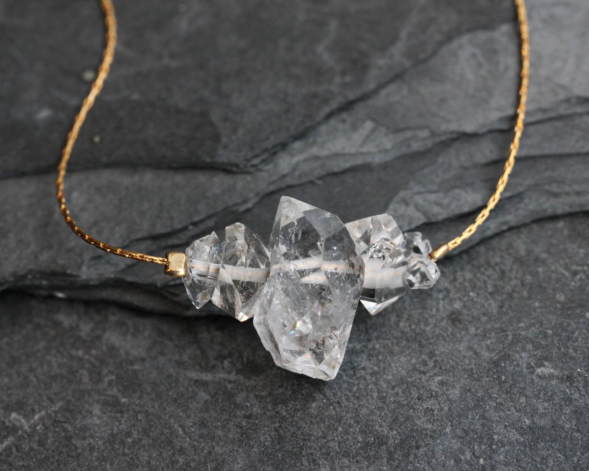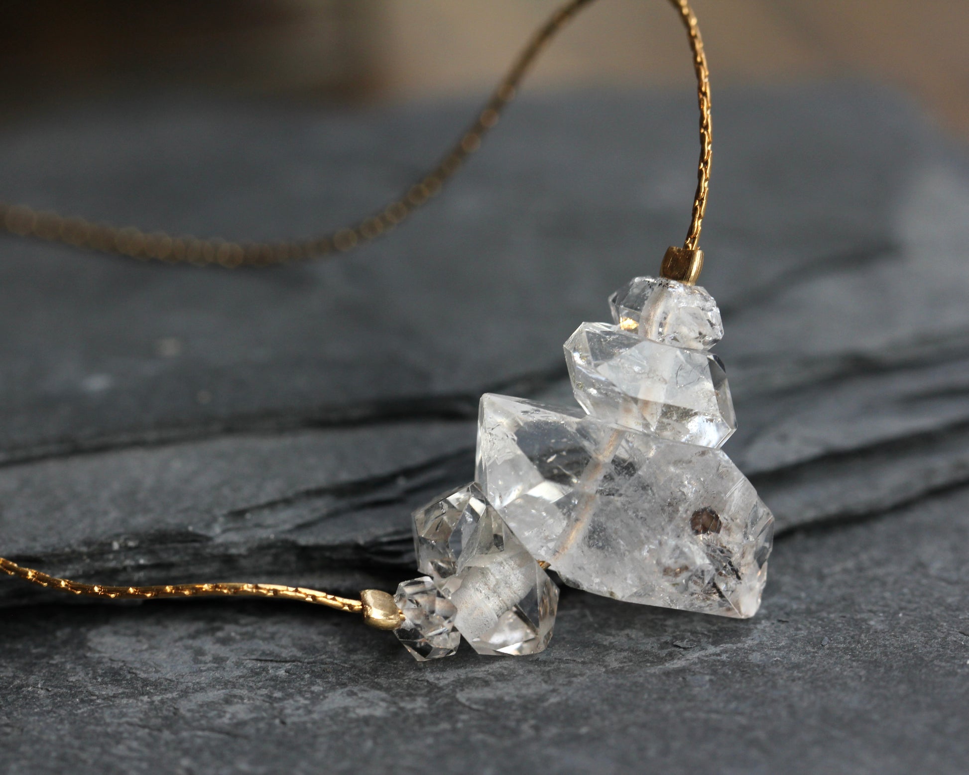 This necklace features a cluster of Herkimer diamonds beads, stacked in a row. This crystal cluster measures 18mm and 1" across. These crystal beads are strung onto a gold filled chain with a length of 16" adjustable up to 18". Another Herkimer diamond crystal accents the end of the extension chain.