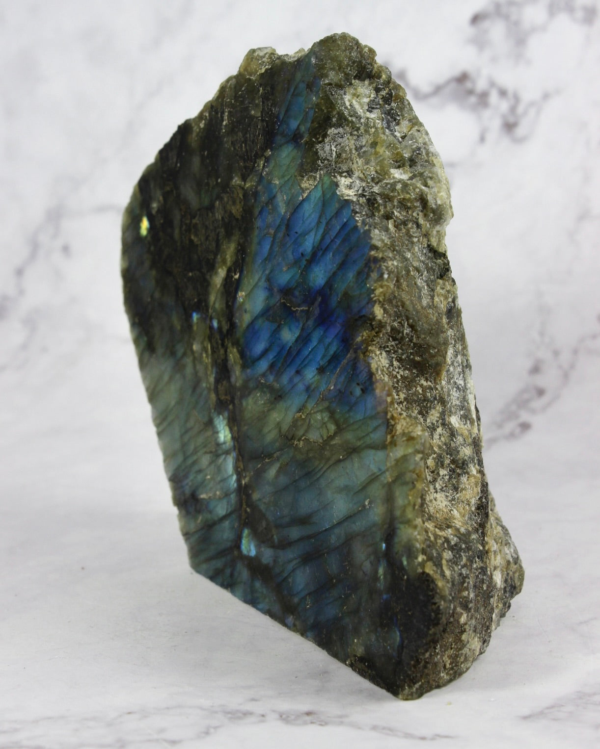This beautiful specimen of labradorite has intense flashes of blue, green and gold throughout its polished surface. It stands up on its own for a perfect display piece.