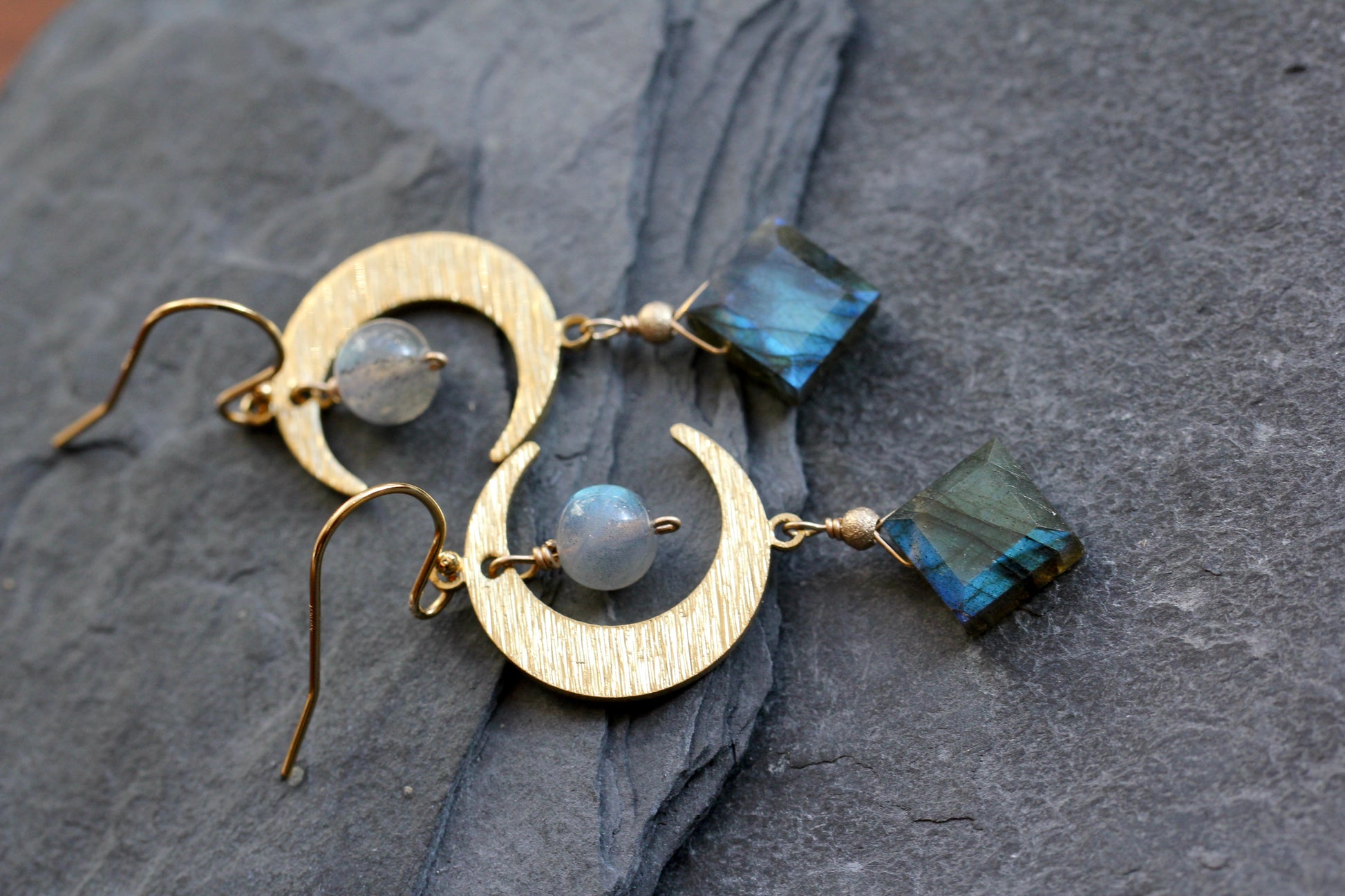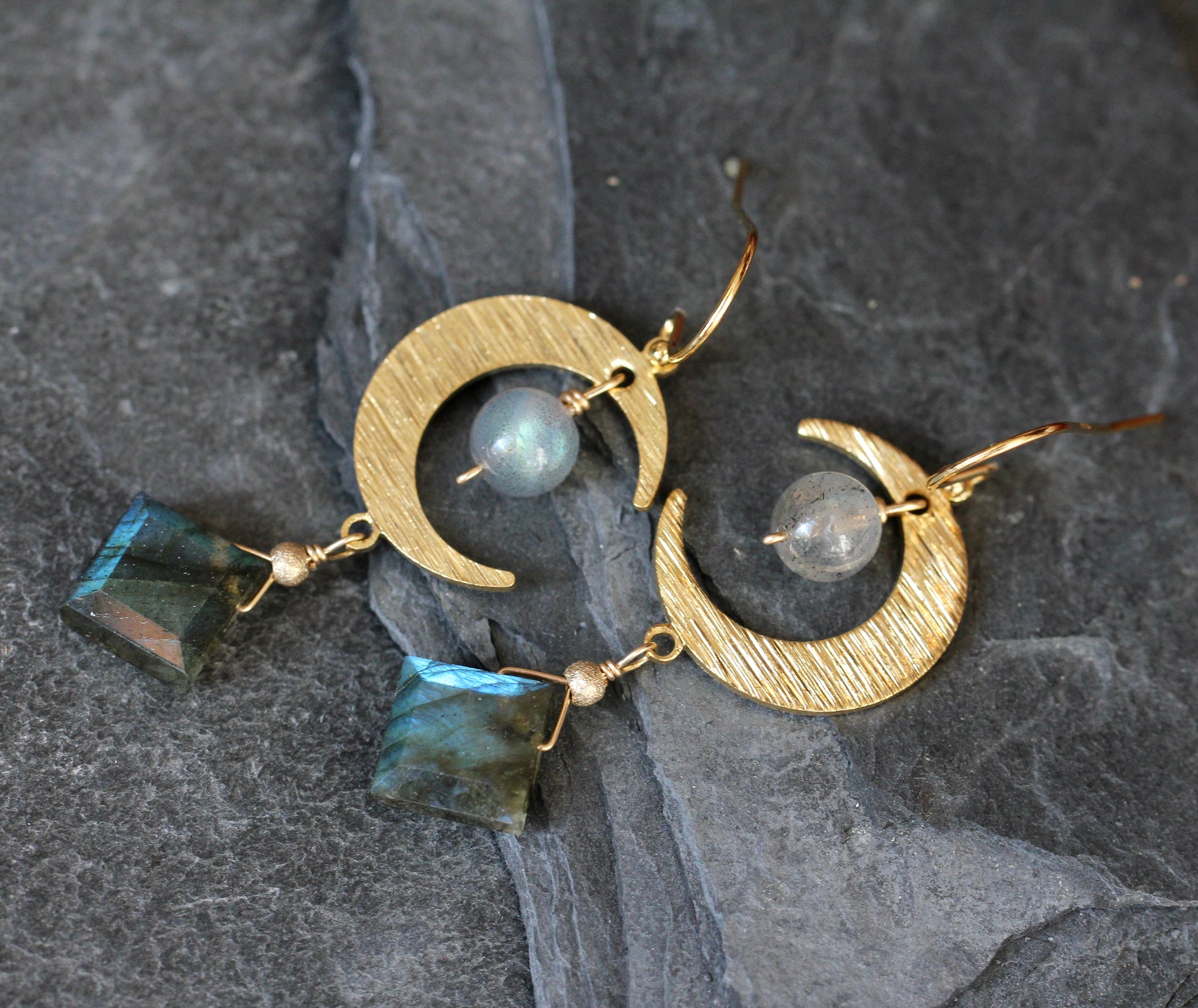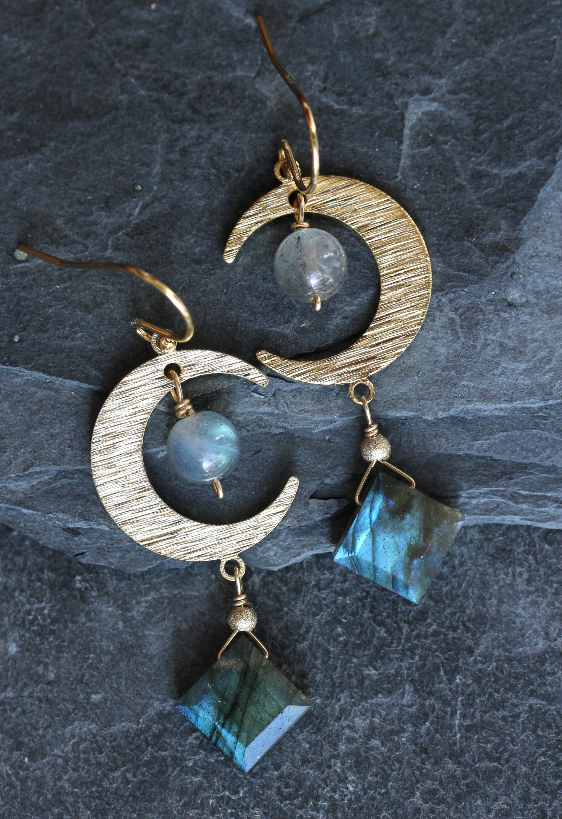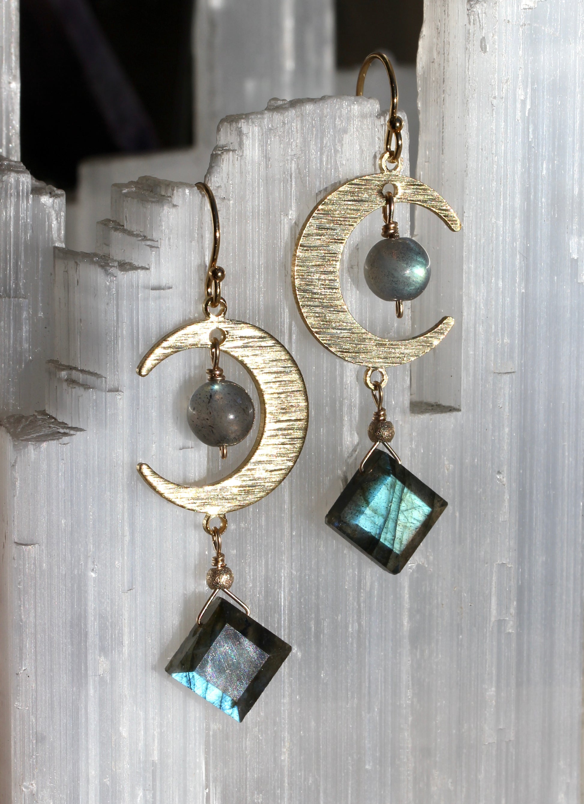 These delightful earrings display gorgeous, flashy, diamond drops of faceted labradorite revealing intense flashes of blue iridescence. They are accented with selenite beads with a lovely cat's eye effect, that hang from a brass moon with a brushed texture. The earrings measure 20mm in width and hang 42mm long from gold filled ear wires.