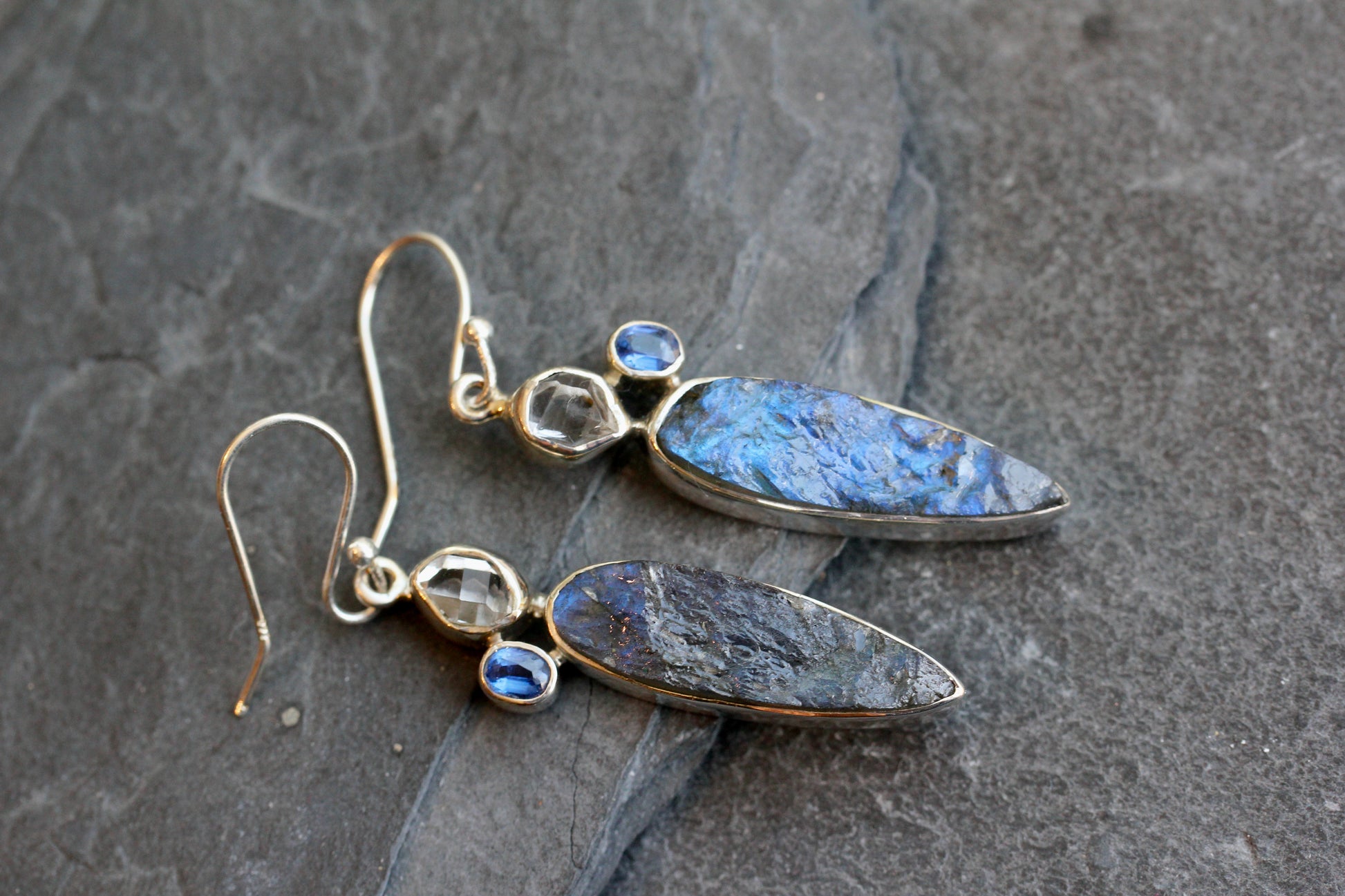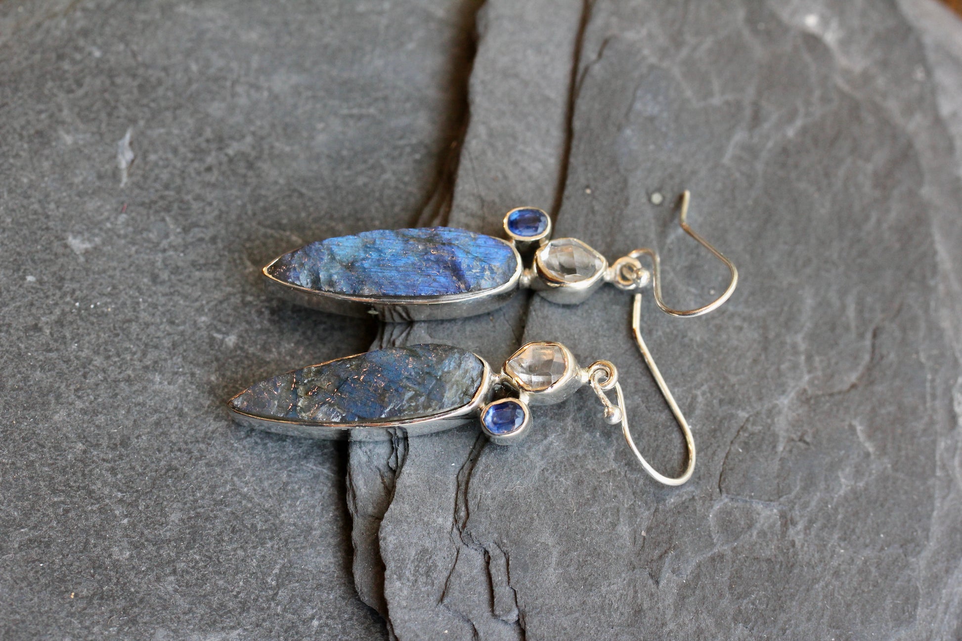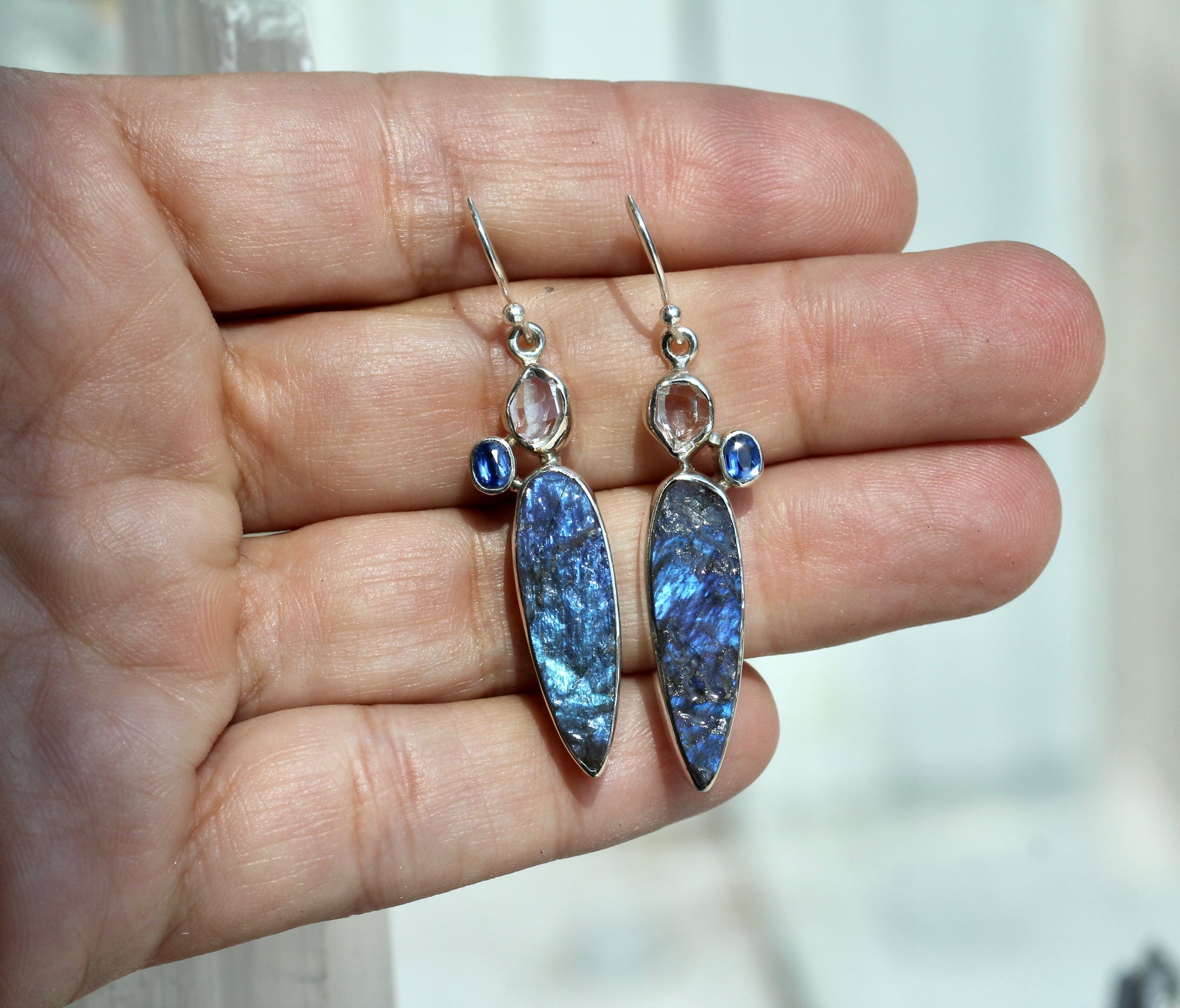These earrings feature labradorite bezel set in sterling silver. Their surface was left raw and unpolished, leaving a natural texture which is rare to see in this stone. It's accented with Herkimer Diamond crystals and faceted, blue kyanite gems. These earrings measure 8mm in width and 40mm in length. They hang from sterling silver, ear wires.