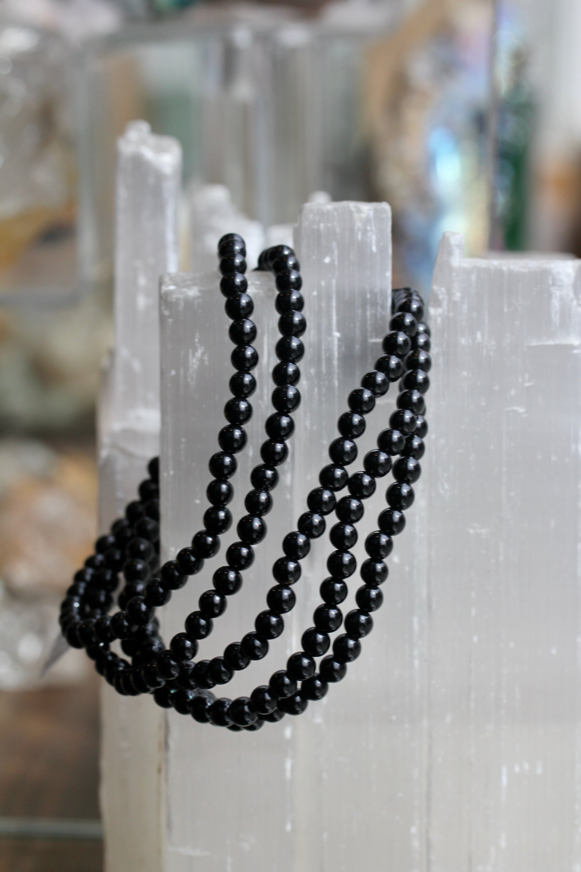 This bracelet displays black onyx beads, strung onto a stretchy elastic for a versatile fit. The beads measure 4mm. Metaphysically, Onyx is commonly referred to as a protective stone. But it protects one by means of strengthening them. Onyx is used to help with focus, discipline, and thusly self-mastery. It assists in strengthening both your mental and physical states. Onyx is a powerful aid in overcoming challenges and promoting confidence. It radiates a strong but calm energy, quelling self-doubts and anxieties.