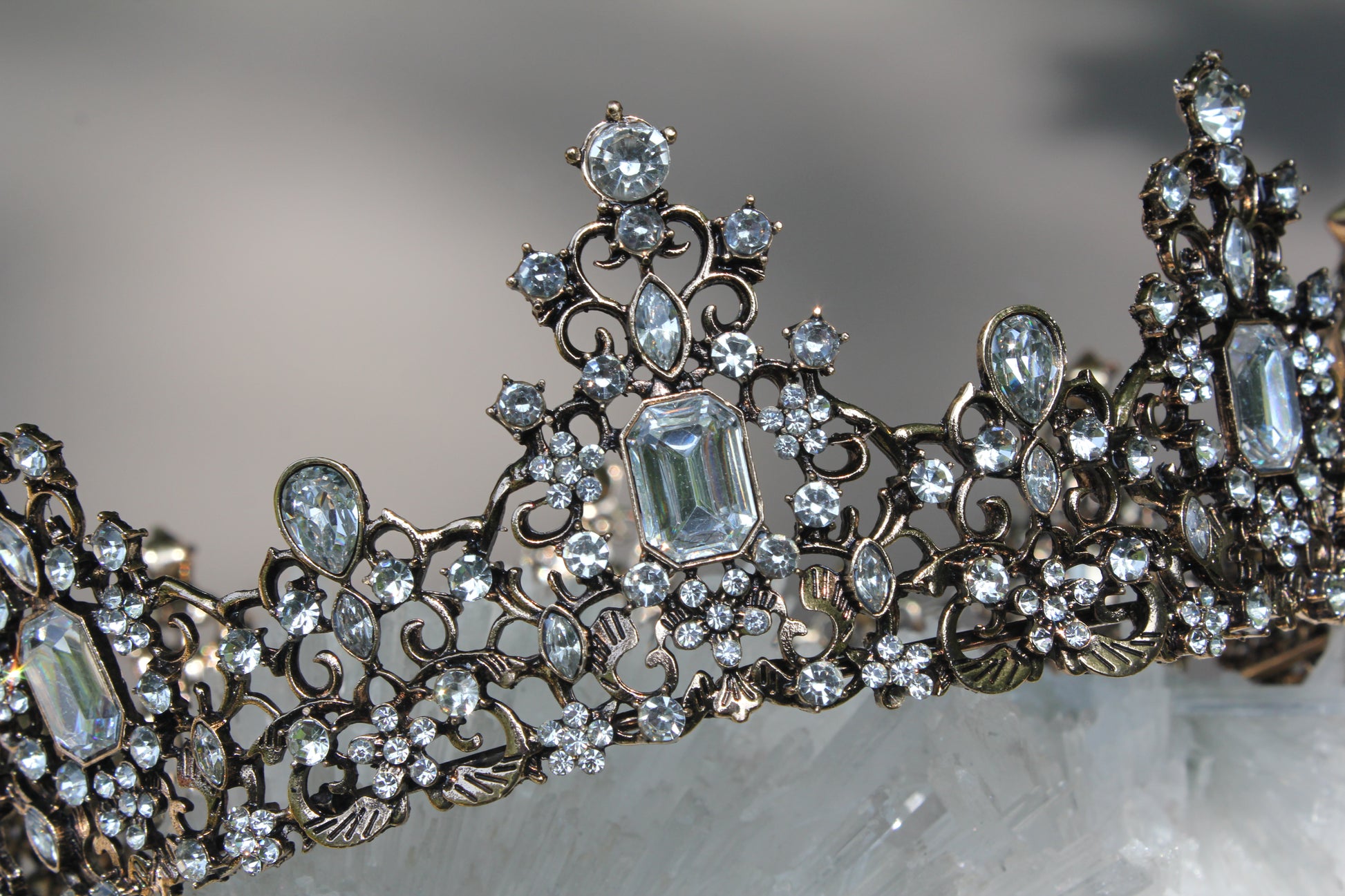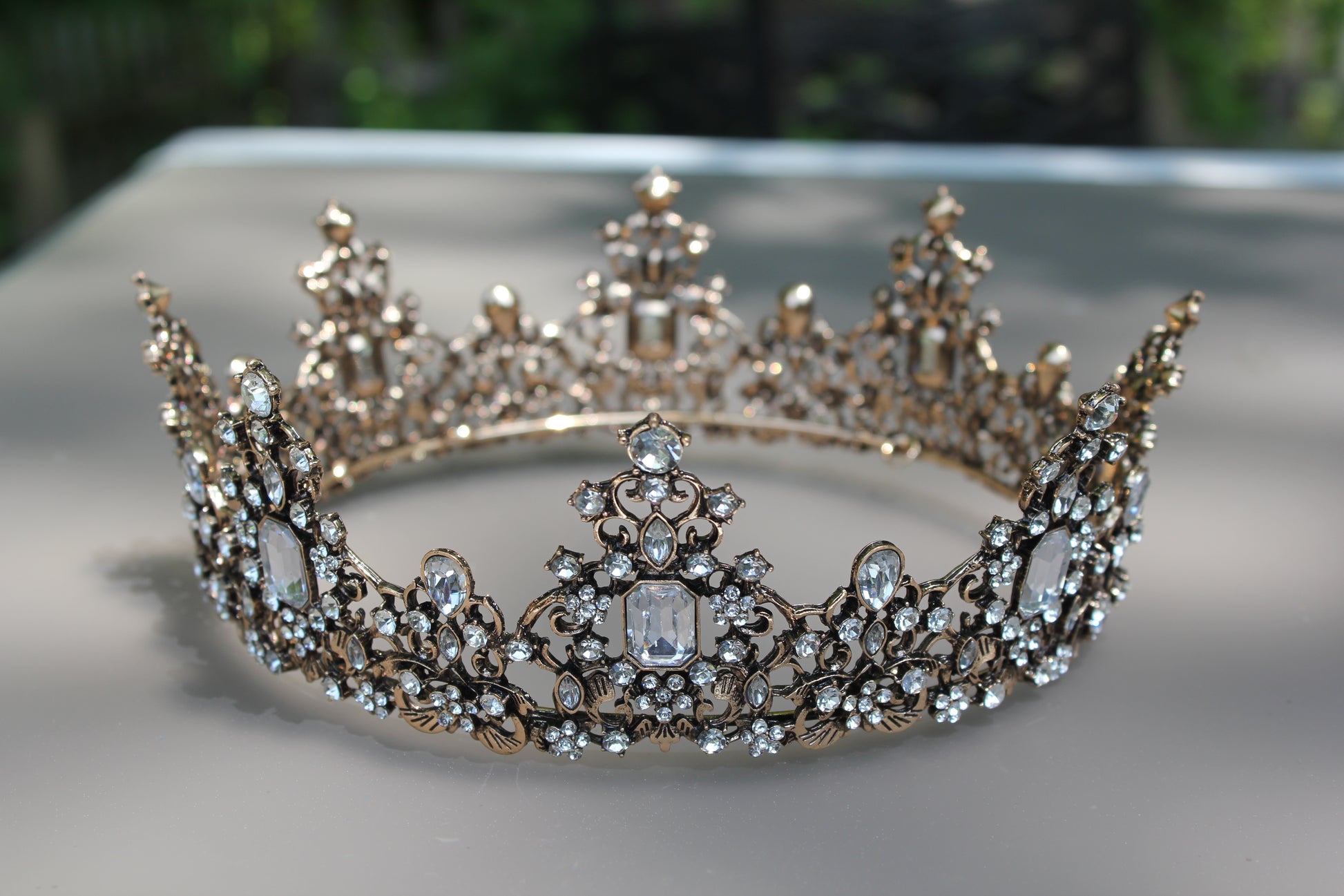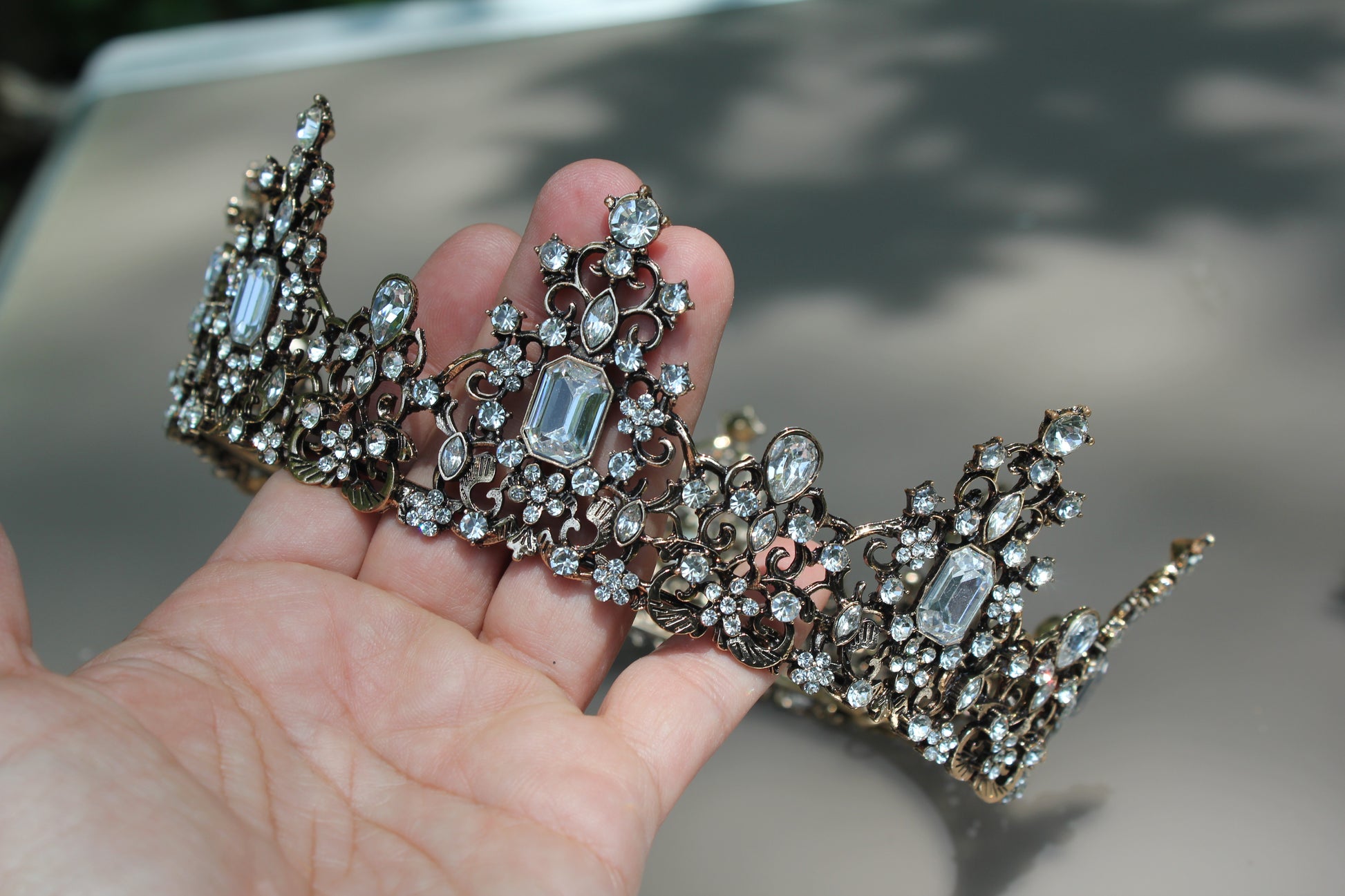 This very ornate crown is encrusted with crystal rhinestones set in an antique brass tone. It measures about 6" in diameter and has four loopholes for fastening hair pins into.