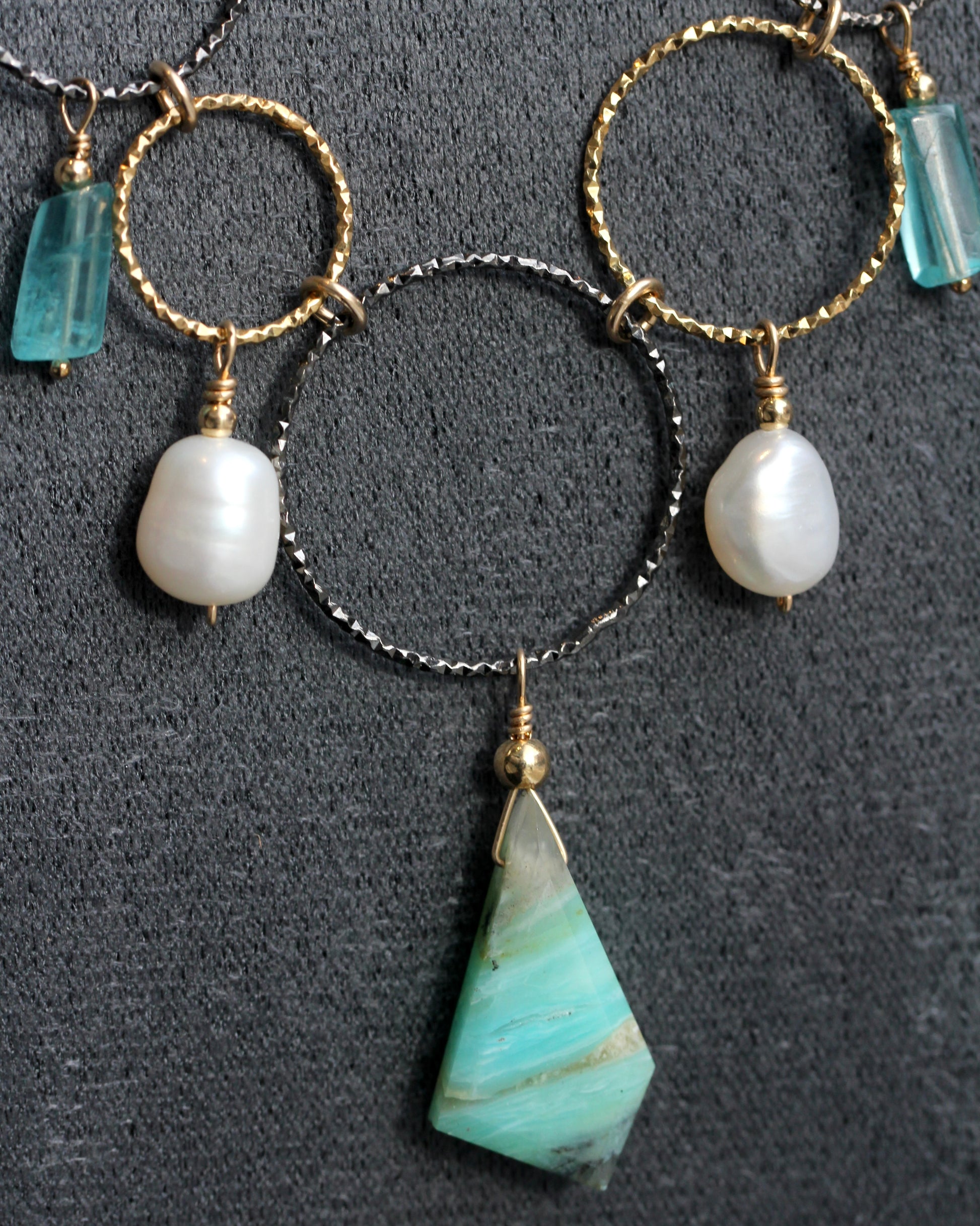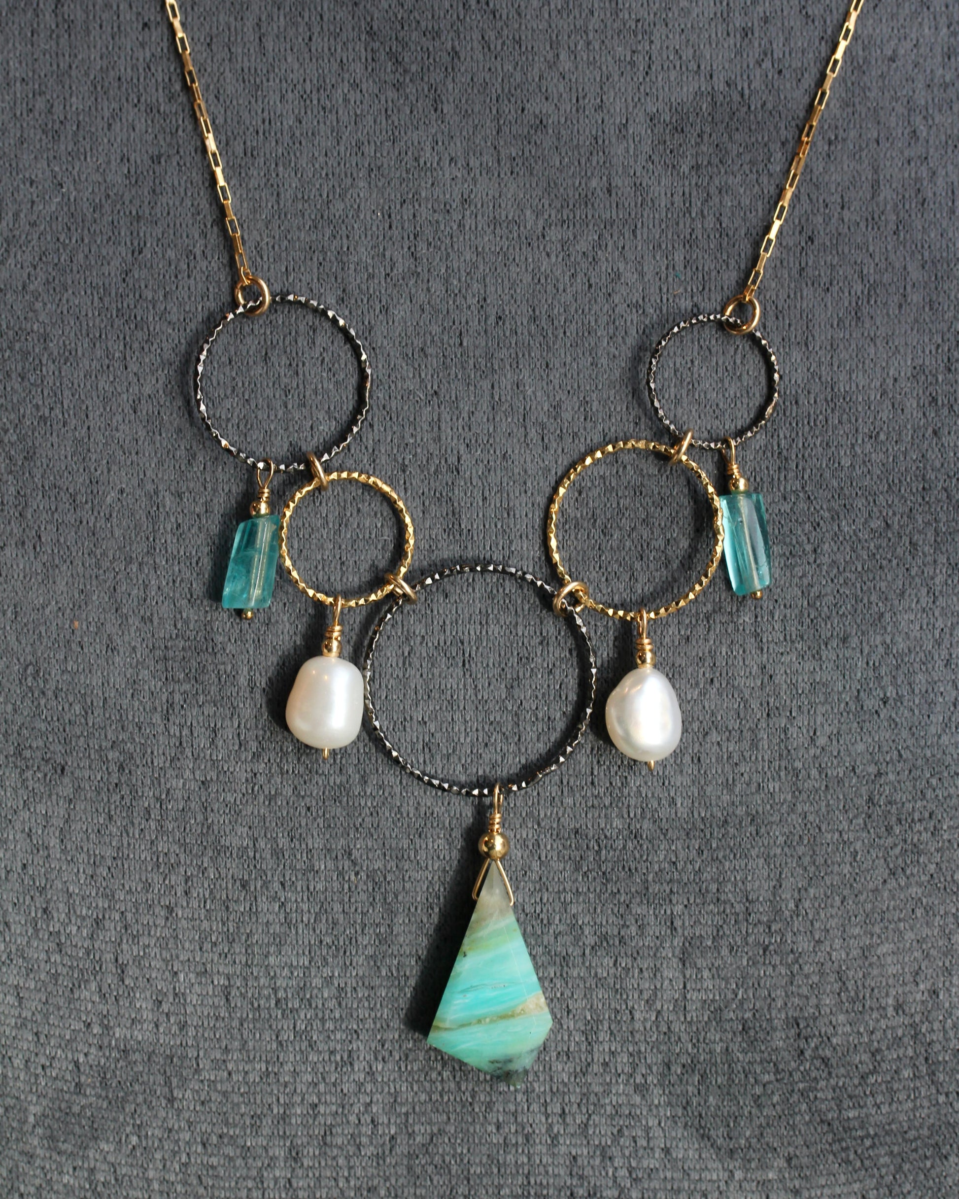 Faceted rings of gold vermeil and oxidized, sterling silver are decorated with drops of blue apatite stones, fresh water pearls and a Peruvian opal. This statement piece is finished with a gold filled chain. The center, large ring with Peruvian opal measures 22mm in width and 50mm in length. The full length of the necklace is 18" adjustable up to 20 1/4".