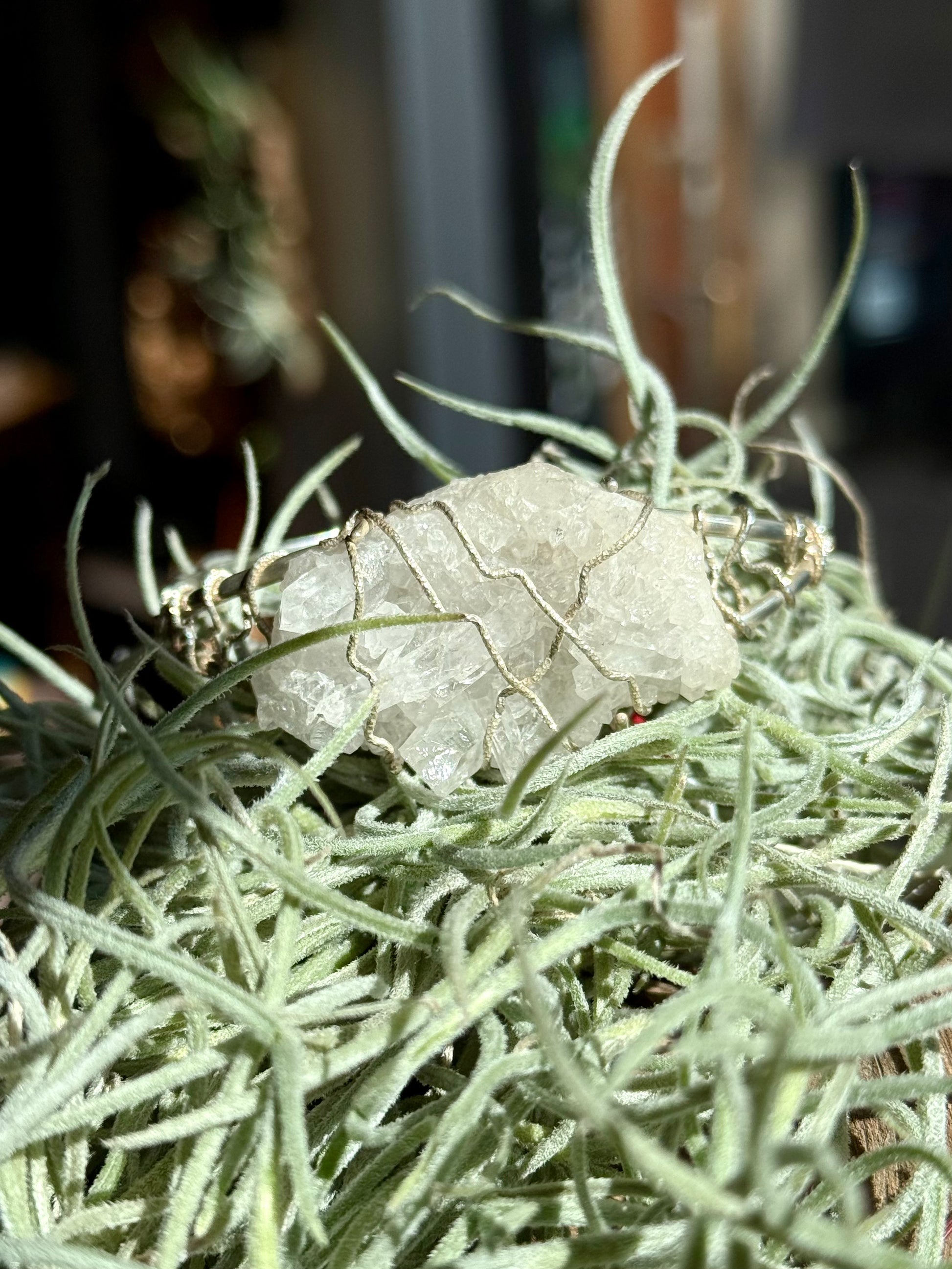 This bracelet features a chunky crystal of clear quartz. This crystal cluster is set into a sterling silver, cuff bracelet. Sterling silver wire work decoratively secures the stone in place and around the cuff. This wire has a diamond cut, faceting which creates a glittery texture. The quartz crystal measures 26mm x 45mm. This statement cuff can be shaped to the wrist for a snug fit.