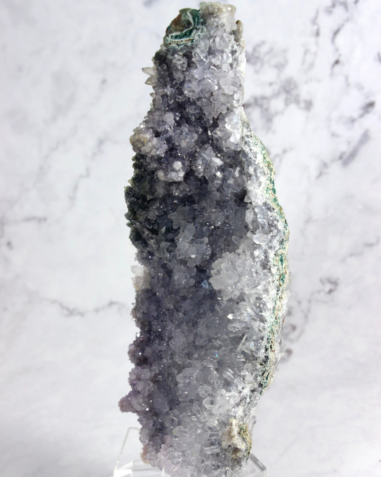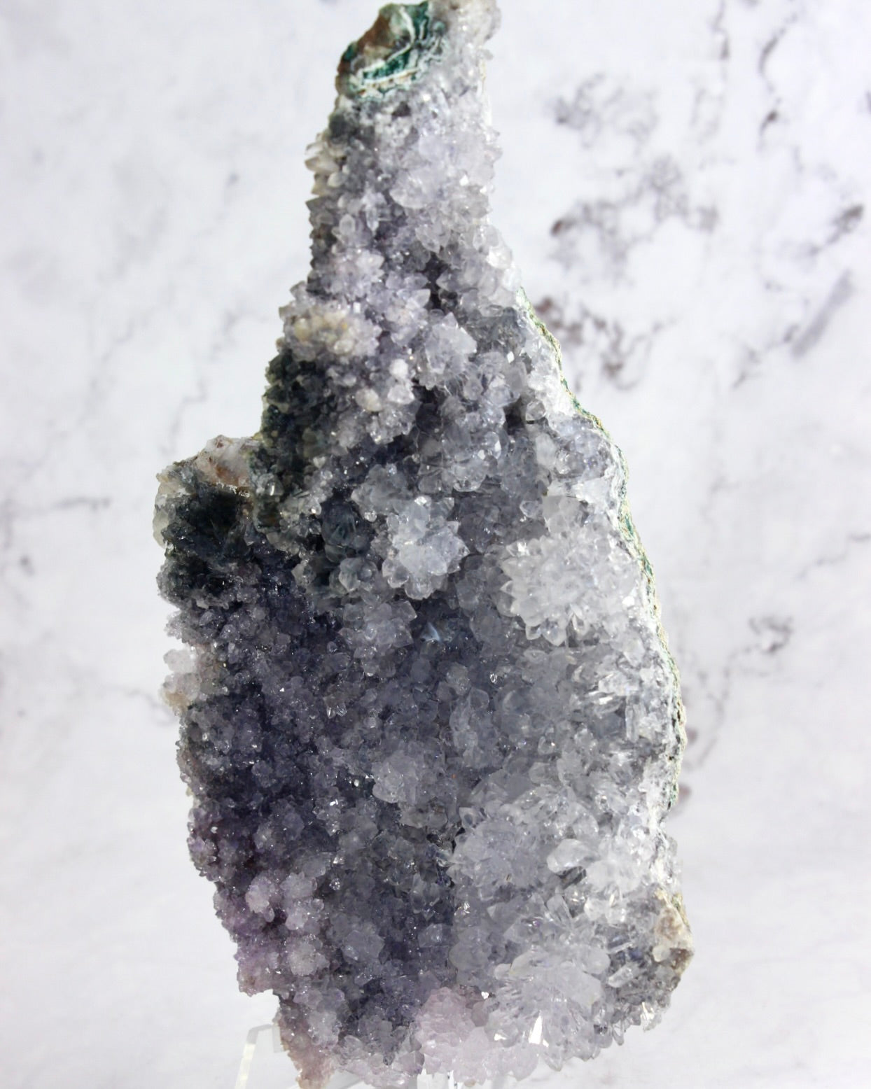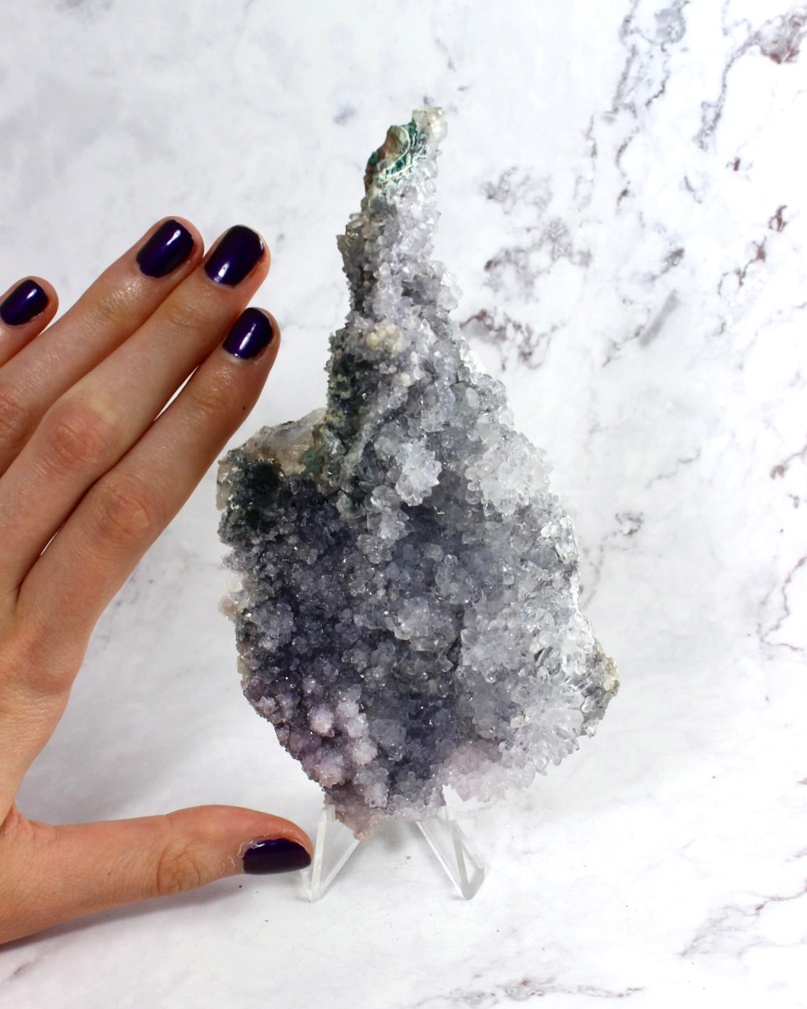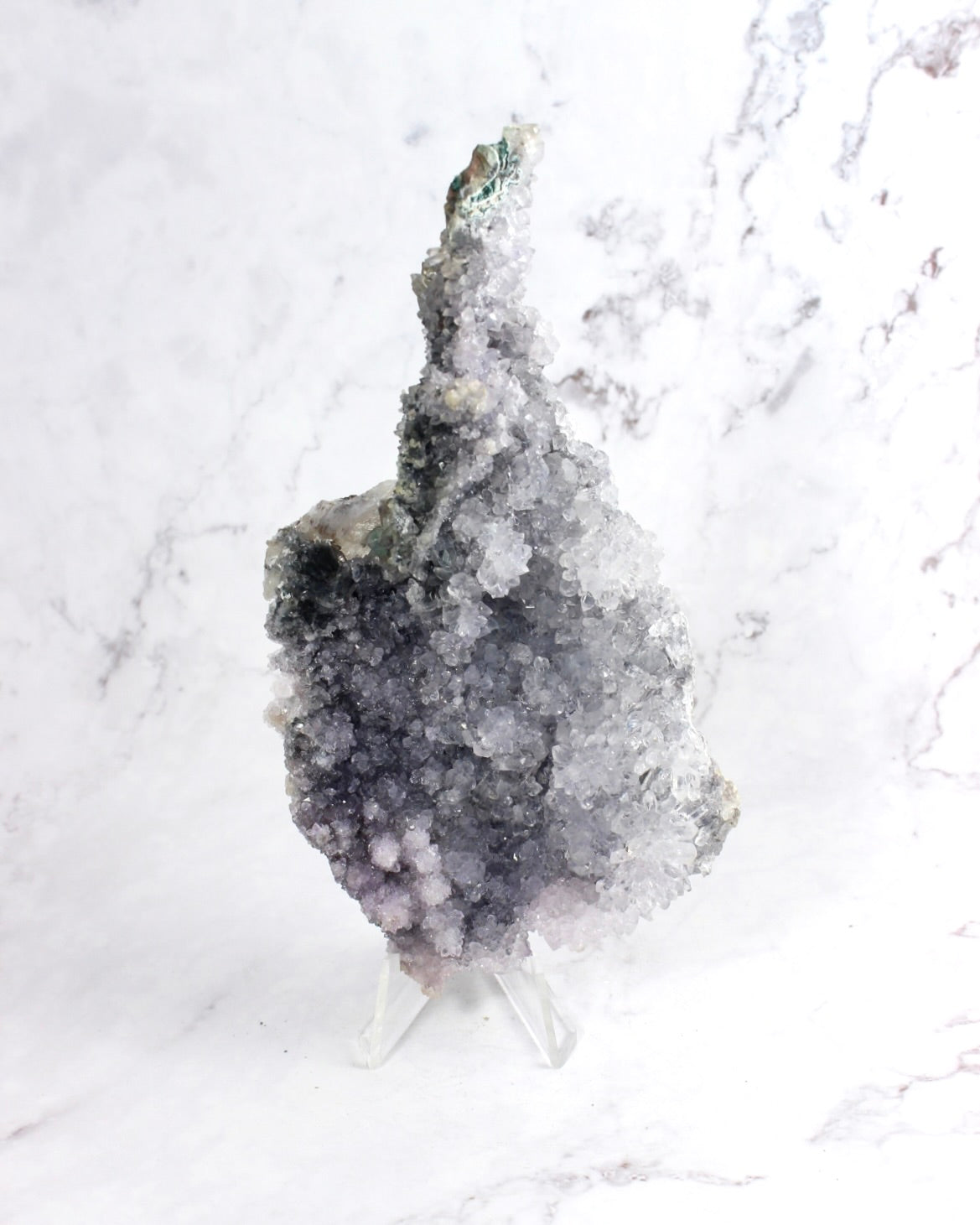This variation of amethyst is known as a Rosette. This specimen got its name from its growth characteristics. Amethyst Rosettes have lots of beautiful variations, from purple to green, from druzy crystals to flower patterns. This amethyst specimen from Brazil showcases a unique silhouette and lilac druzy crystals. Comes with the acrylic stand pictured.