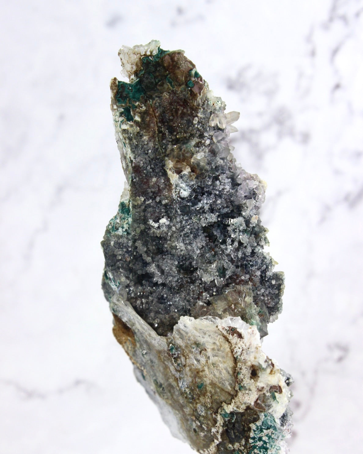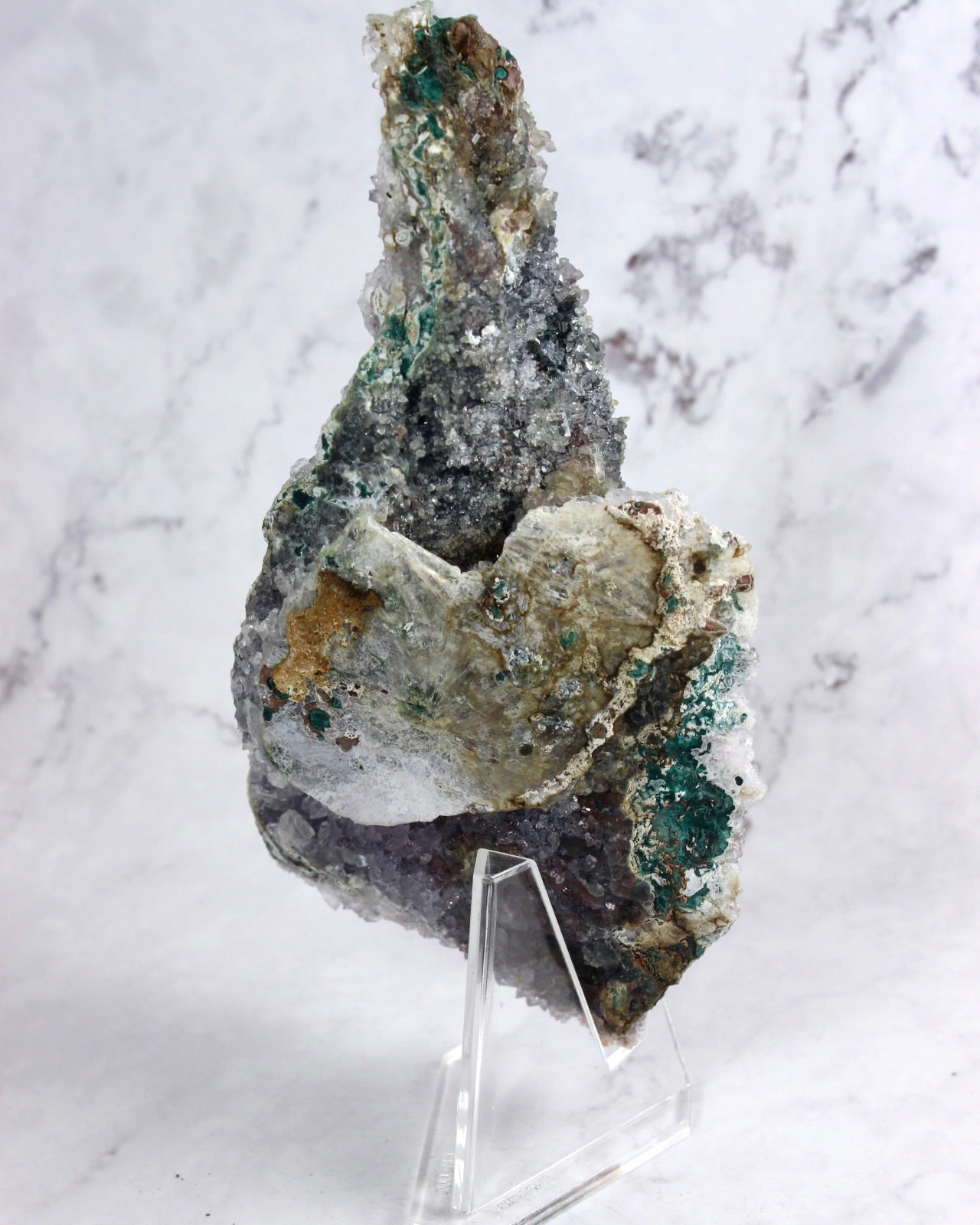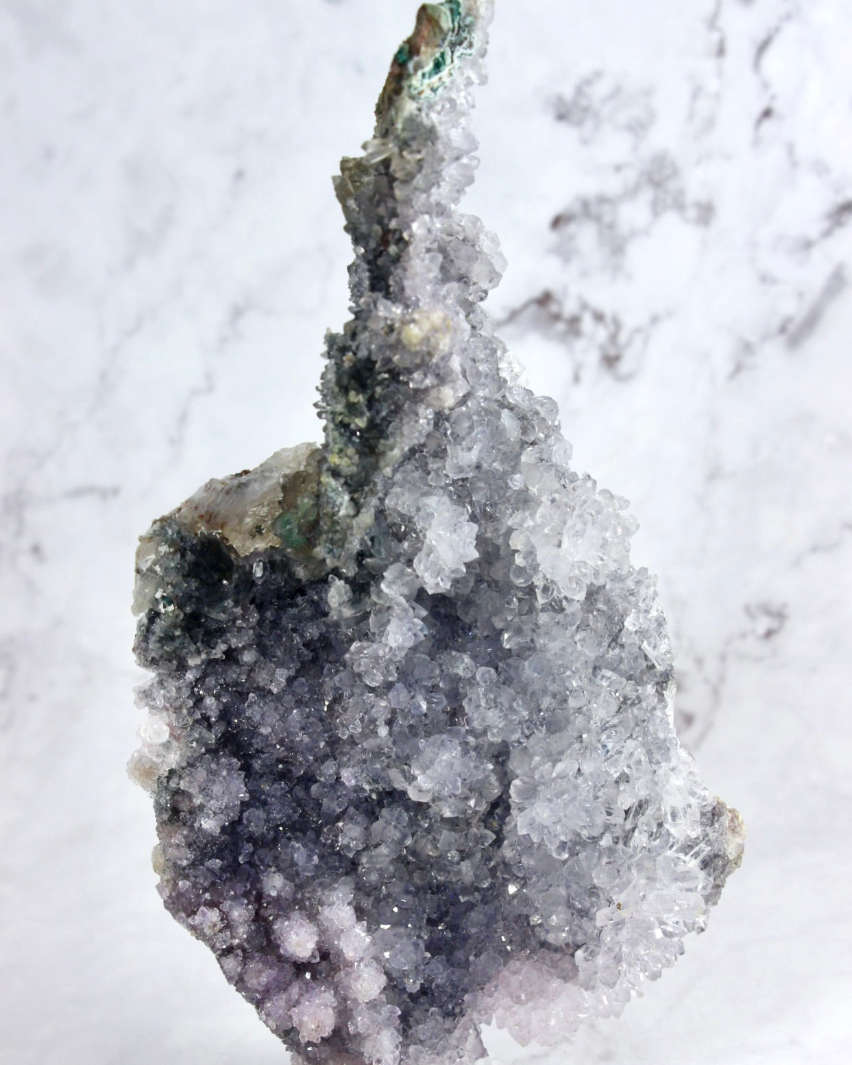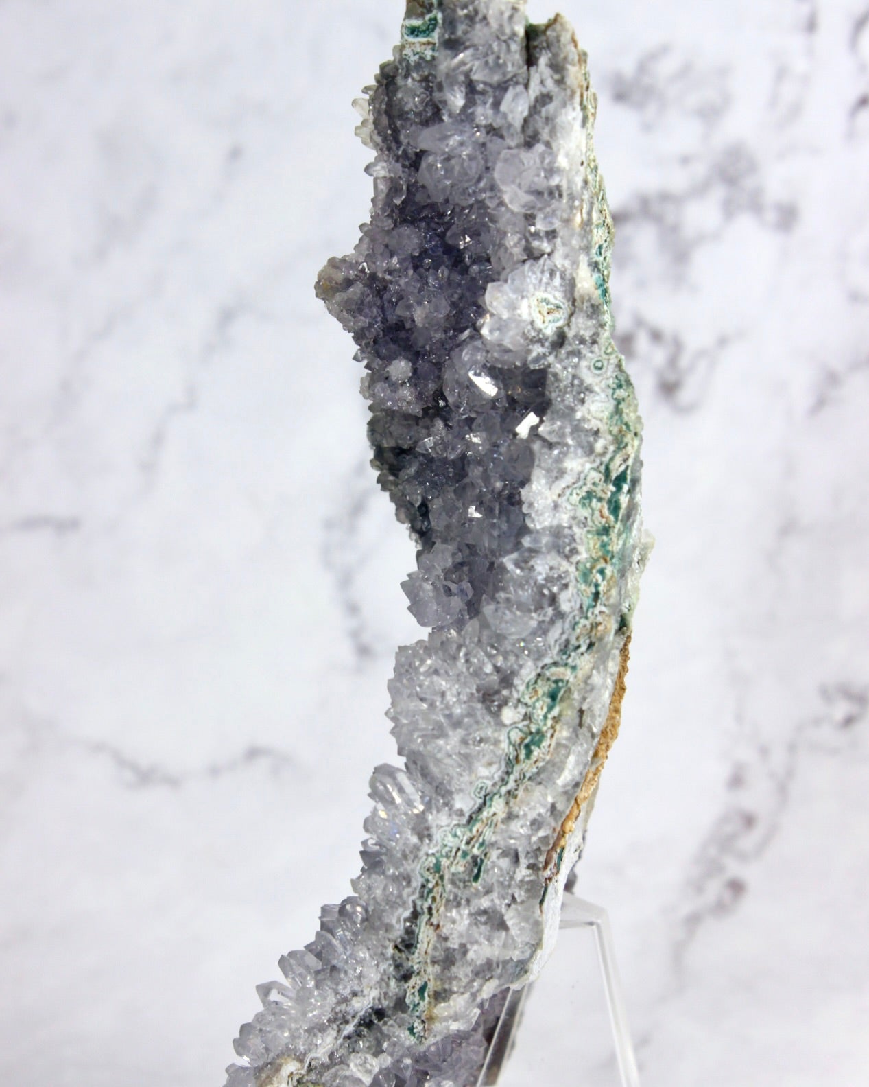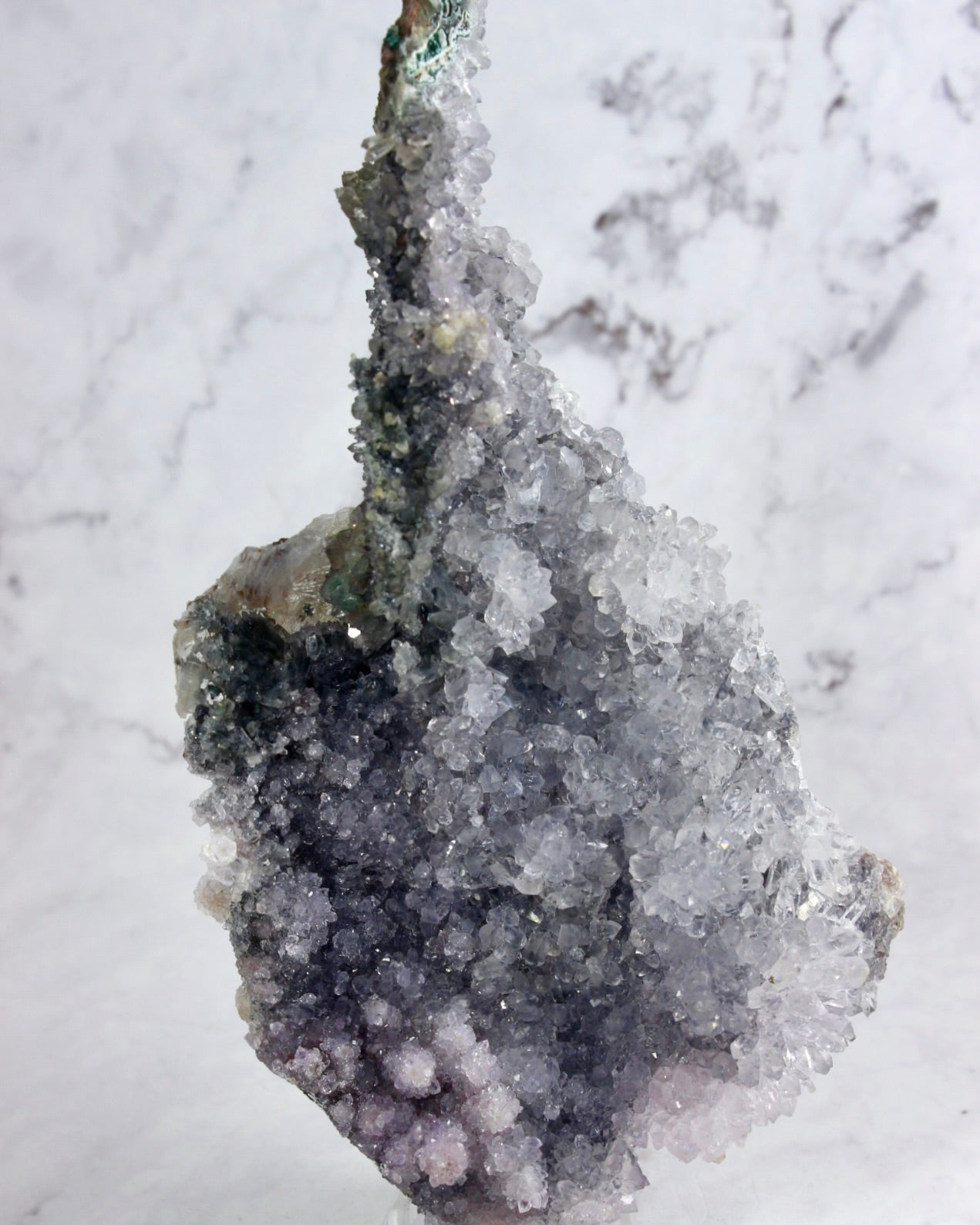 This variation of amethyst is known as a Rosette. This specimen got its name from its growth characteristics. Amethyst Rosettes have lots of beautiful variations, from purple to green, from druzy crystals to flower patterns. This amethyst specimen from Brazil showcases a unique silhouette and lilac druzy crystals. Comes with the acrylic stand pictured.