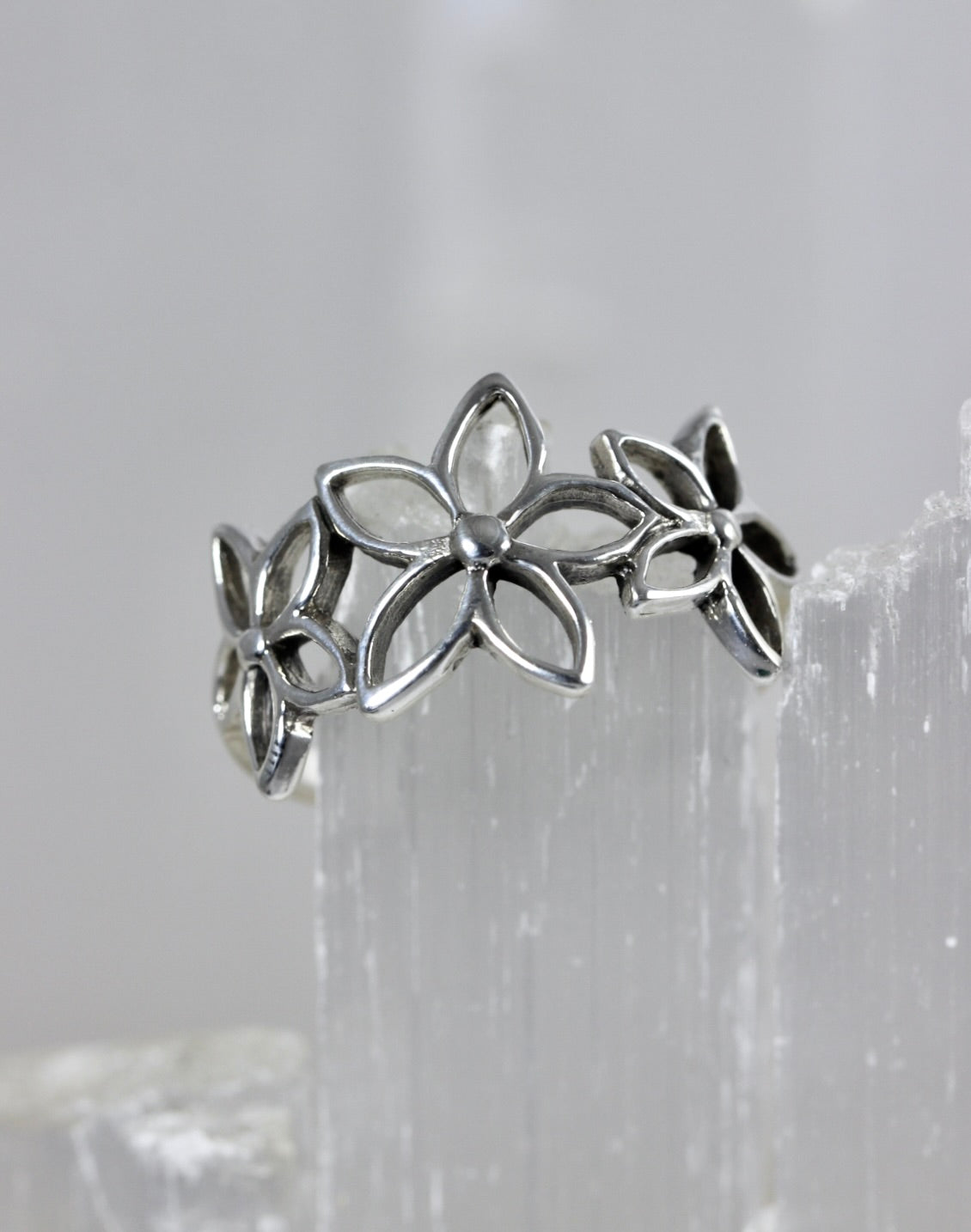 This ring is part of our curated collection of other jewelry that we import into our brick and mortar store. This piece displays 3 silver flowers in a row with a open petal design.
