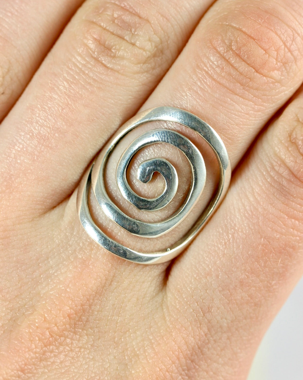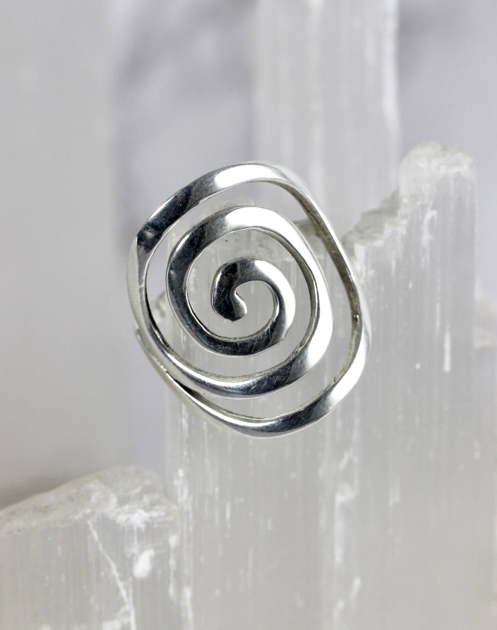 This sterling silver ring is part of our curated collection that we sell in our brick and mortar store. This ring is decorated with a spiral design and is available in multiple sizes.