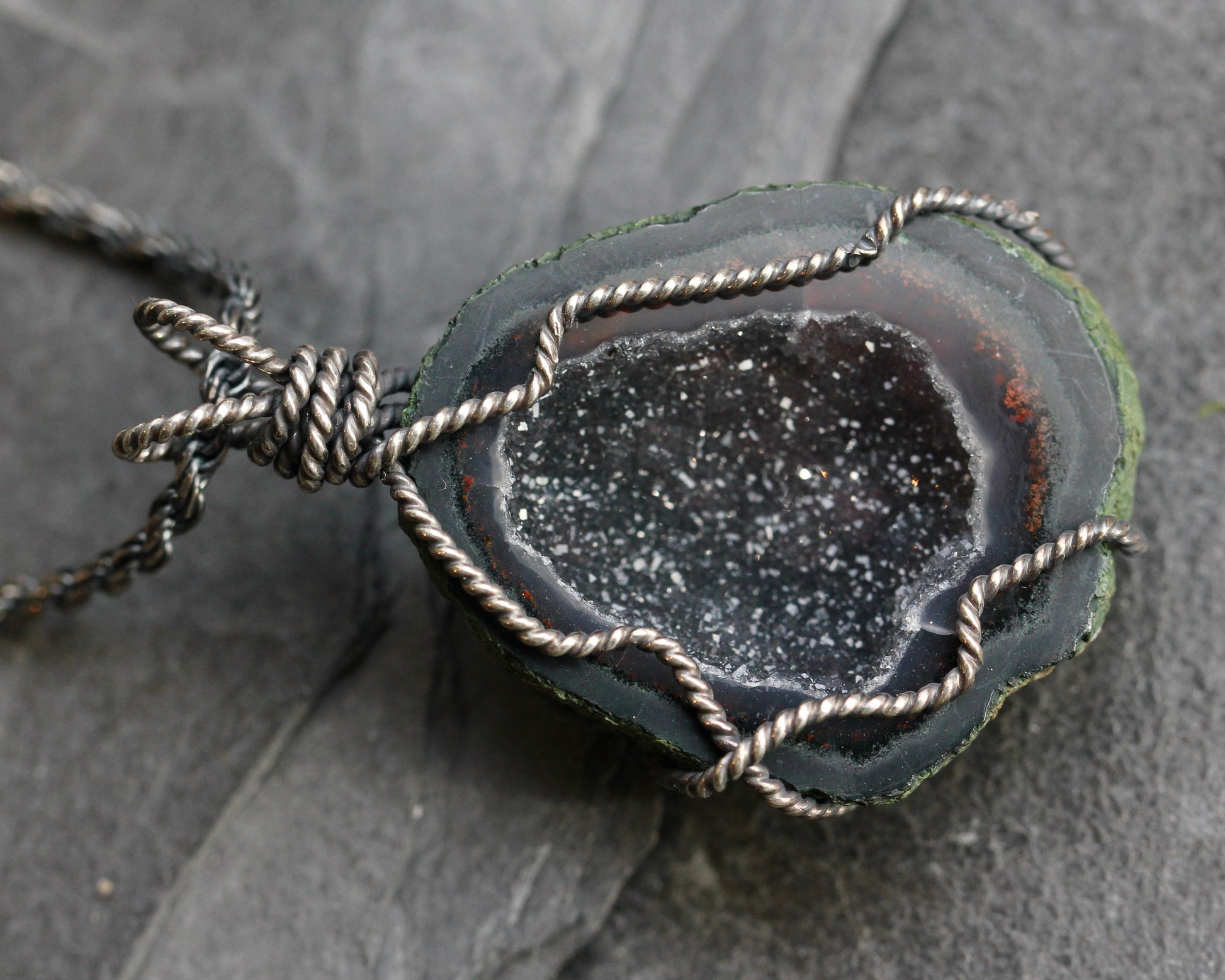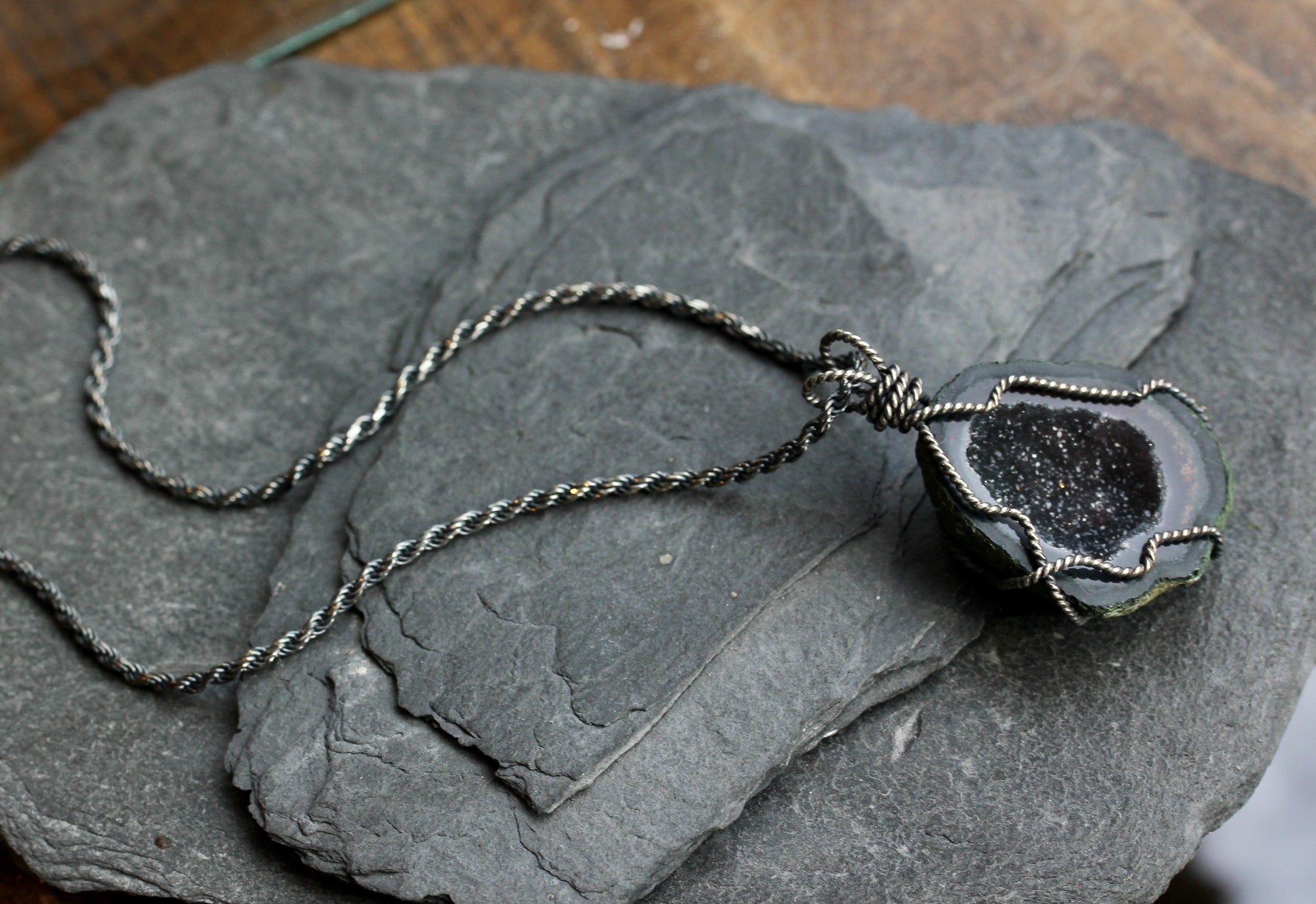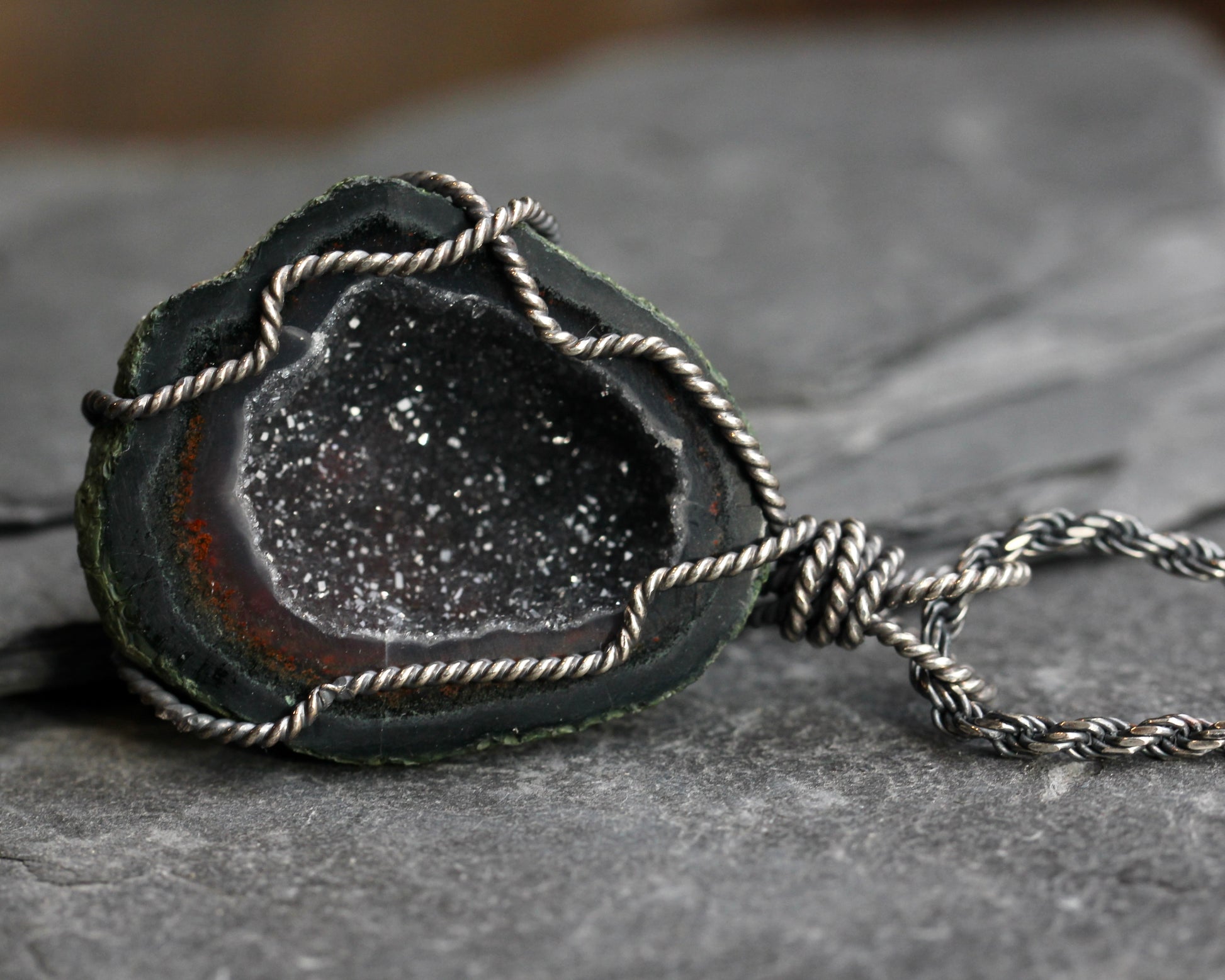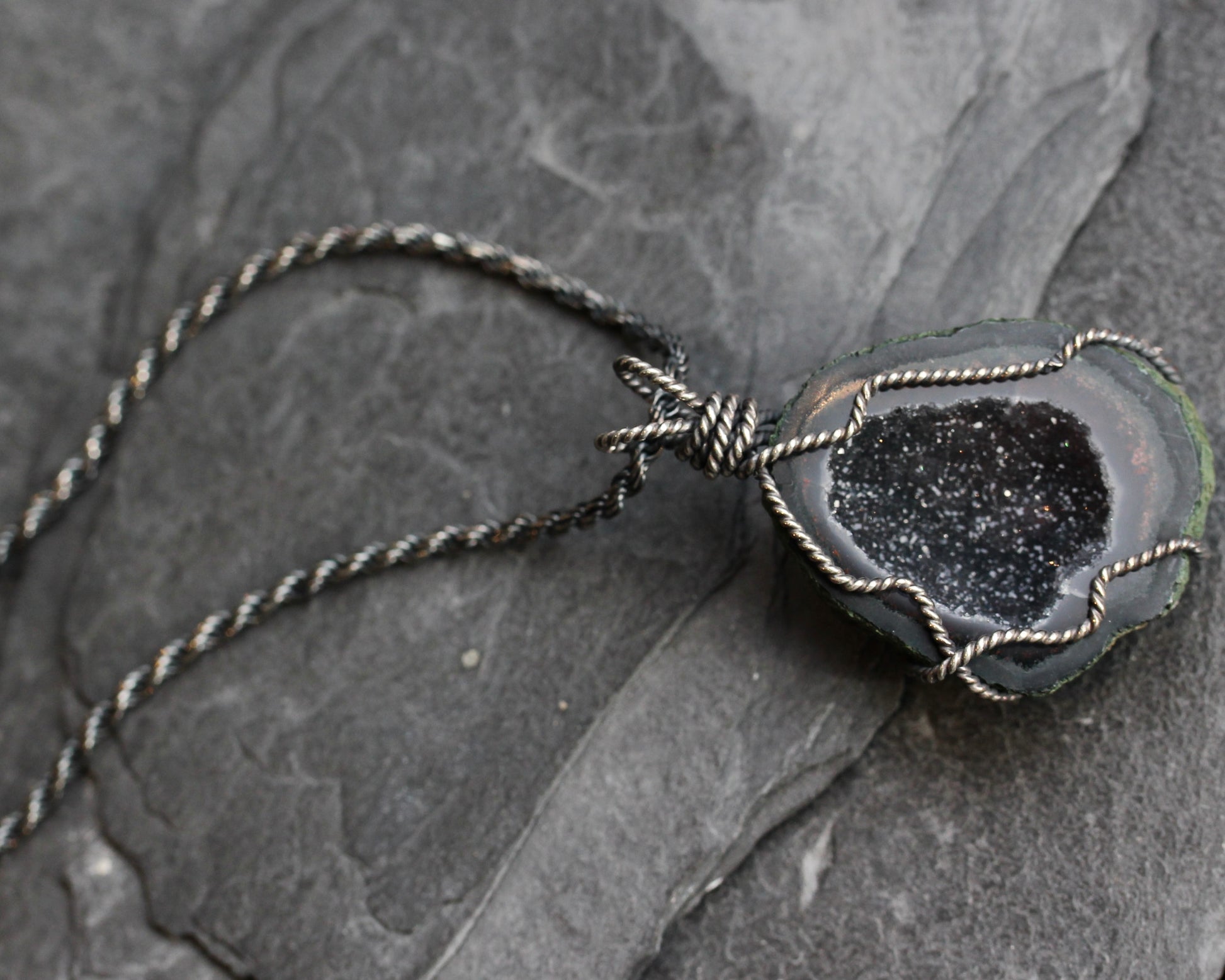 This necklace features a Tobasco geode filled with sparkling crystals creating a black, druzy inside. The geode is suspended by sterling silver wire which has been oxidized to bring out its rope like texture. In this listing you may purchase the pendant alone or add the chain shown in the pictures. This is an oxidized, sterling silver, rope chain with a length of 30".