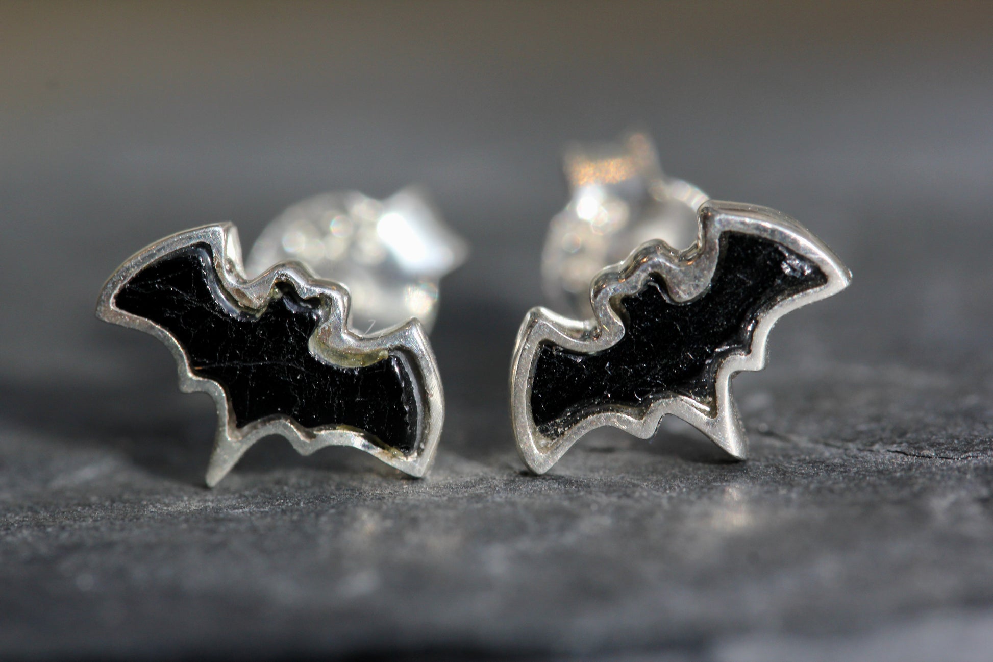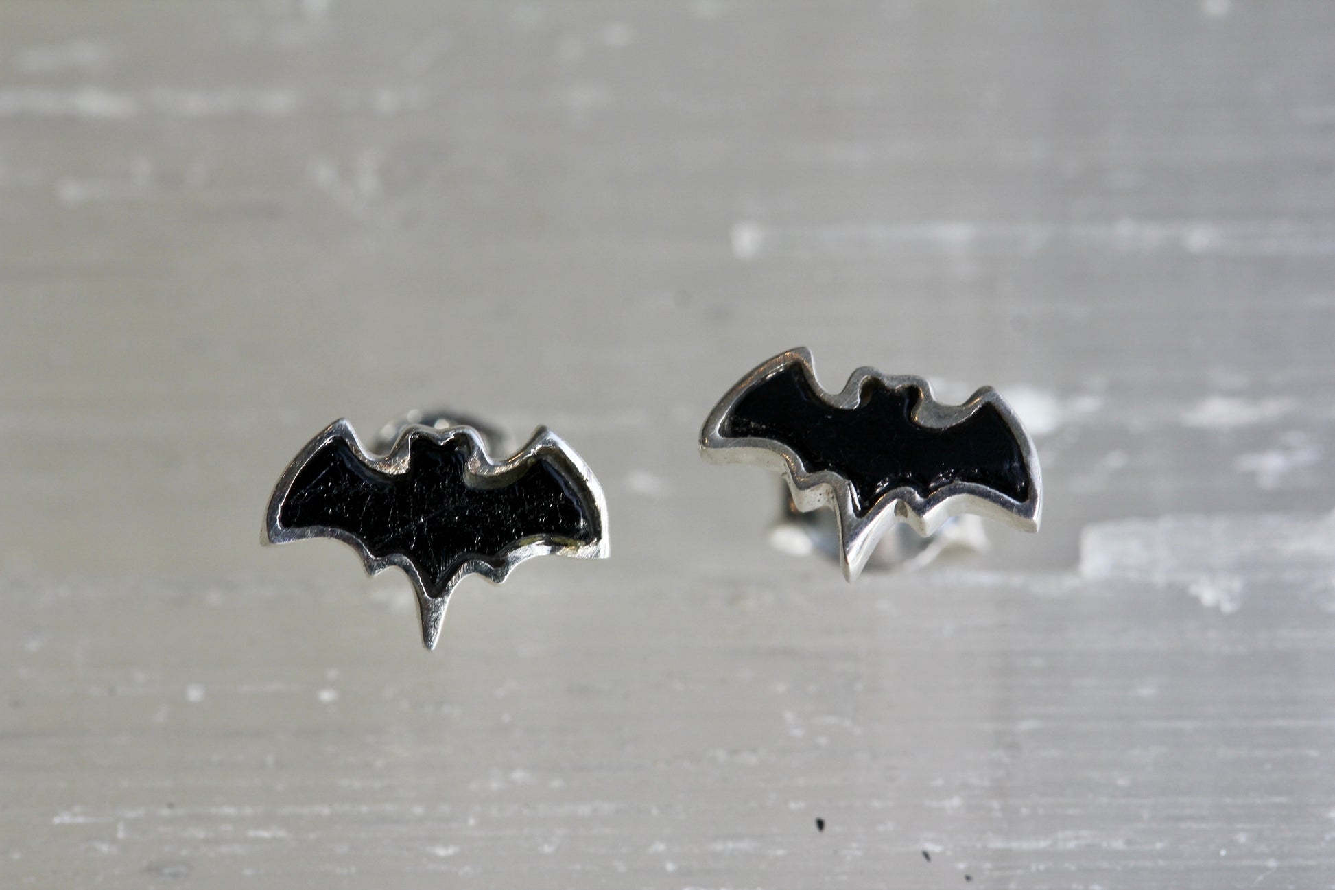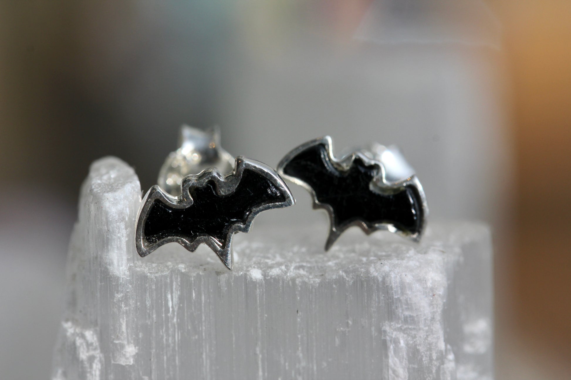 These earrings feature black tourmaline stones cut and shaped into a little bat. Resembling the "Batman" symbol, they are set in sterling silver and measure 6mm x 10mm.