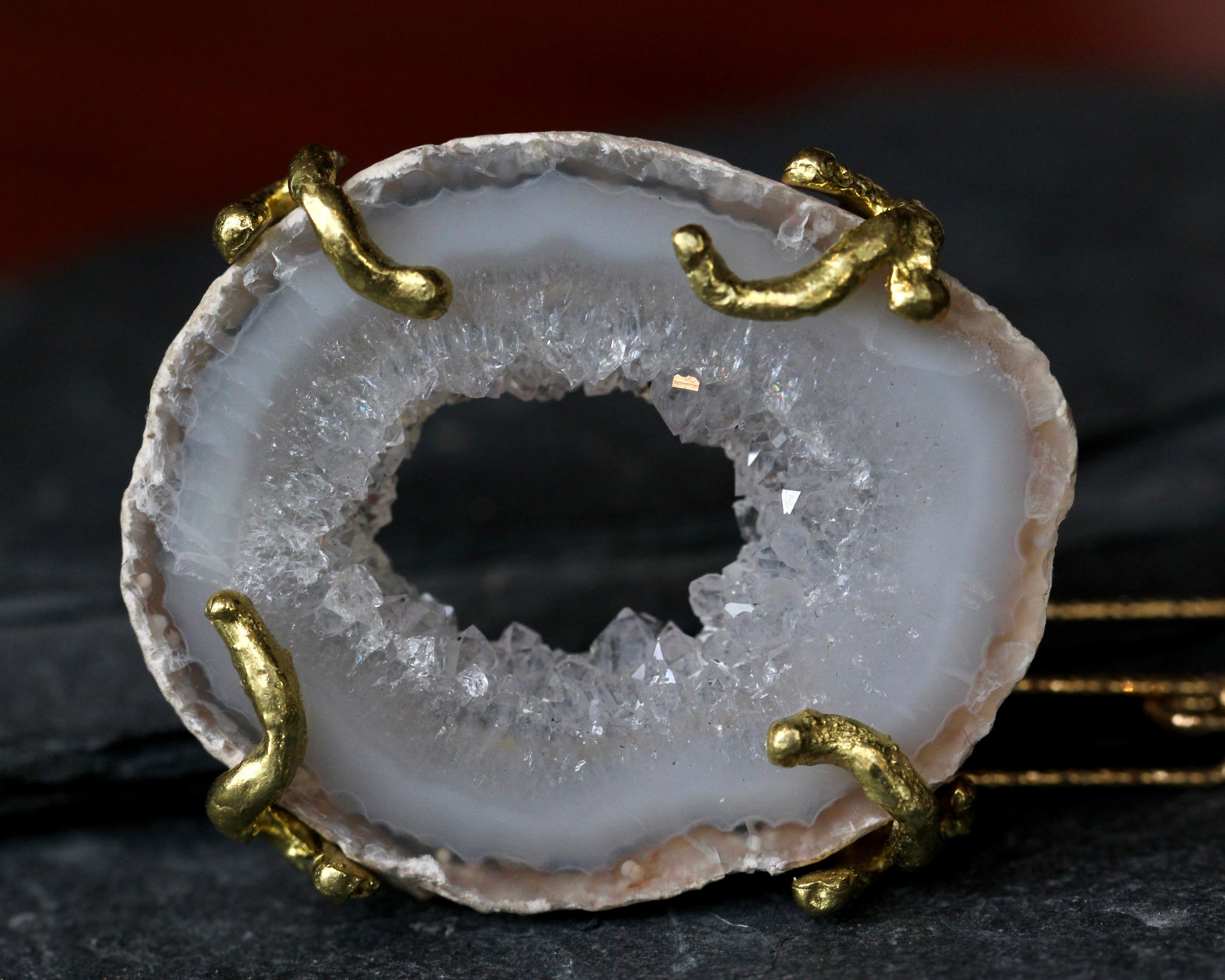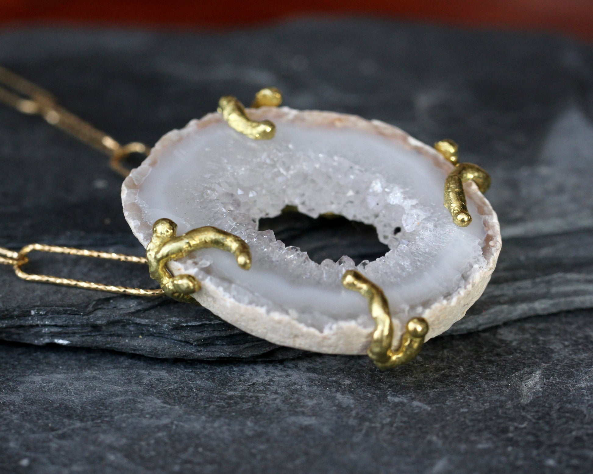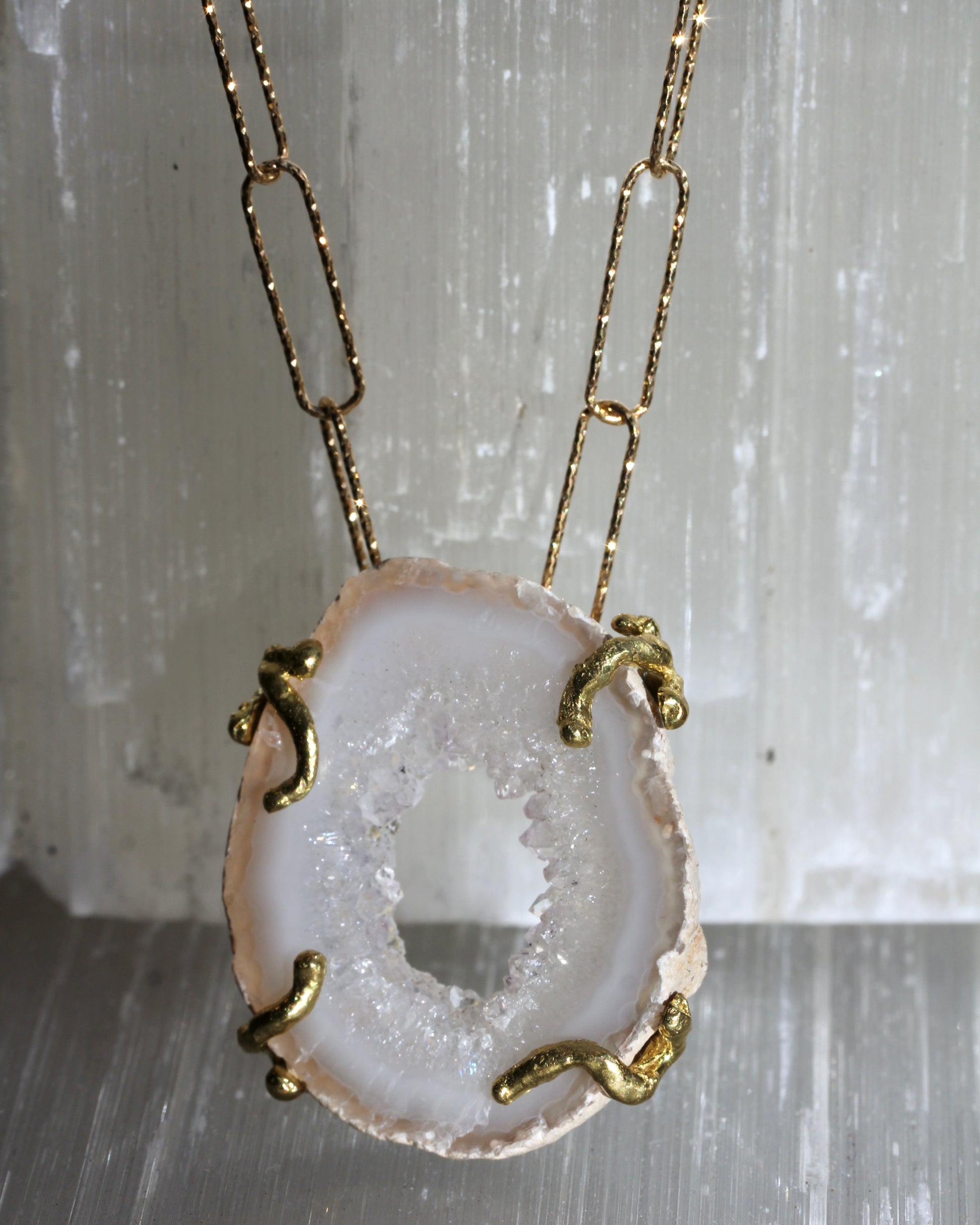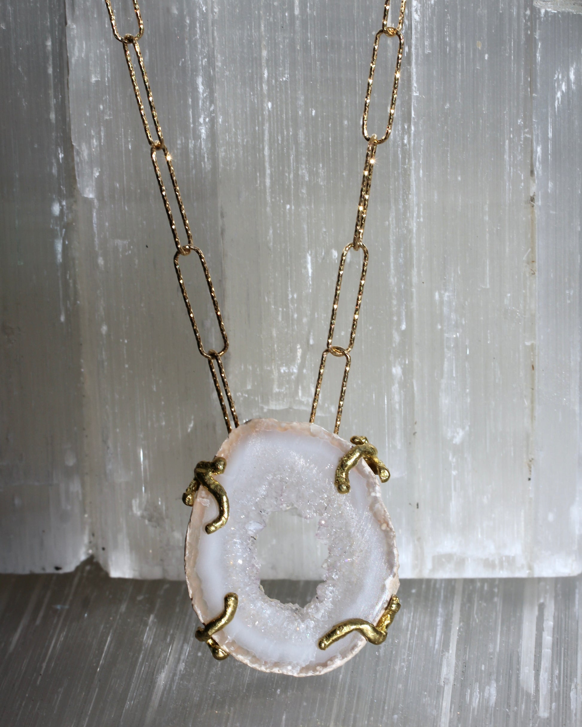 This necklace features a slice of white agate with a druzy of crystatls at its center. It sits in a raw, brass setting. This winter white stone measures 27mm x 35mm and is suspended between a gold vermeil, paper clip chain with a sparkle texture. The length of the necklace is 18 13/4" adjustable up to 21". A selenite bead accents the gold filled, extension chain.